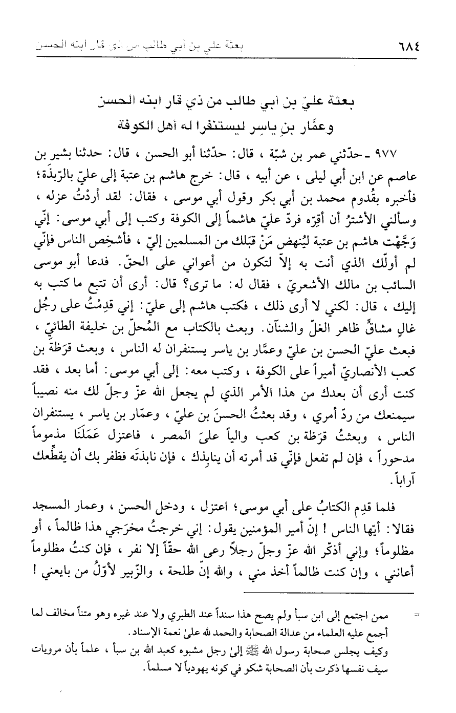 ٩٧٧ - حدّثني عمر بن شبّة، قال: حدّثنا أبو الحسن، قال: حدثنا بشير بن عاصم عن ابن أبي ليلى، عن أبيه، قال: خرج هاشم بن عتبة إلى عليّ بالرّبذَة؛ فأخبره بقُدوم محمد بن أبي بكر وقول أبي موسى، فقال: لقد أردْتُ عزله، وسألني الأشترُ أن أقِرّه فردّ عليّ هاشمًا إلى الكوفة وكتب إلى أبي موسى: إنّي وَجَّهْت هاشم بن عتبة ليُنهض مَنْ قبَلك من المسلمين إليّ، فأشخِص الناس فإنّي لم أولّك الذي أنت به إلّا لتكون من أعواني على الحقّ. فدعا أبو موسى السائب بن مالك الأشعريّ، فقال له: ما ترى؟ قال: أرى أن تتبع ما كتب به إليك، قال: لكني لا أرى ذلك، فكتب هاشم إلى عليّ: إني قدِمْتُ على رجُل غالٍ مشاقٍّ ظاهر الغلّ والشنآن. وبعث بالكتاب مع المُحلّ بن خليفة الطائيّ، فبعث عليّ الحسن بن عليّ وعمَّار بن ياسر يستنفران له الناس، وبعث قرَظةَ بن كعب الأنصاريّ أميرًا على الكوفة، وكتب معه: إلى أبي موسى: أما بعد، فقد كنت أرى أن بعدك من هذا الأمر الذي لم يجعل الله عزّ وجلّ لك منه نصيبًا سيمنعك من ردّ أمري، وقد بعثتُ الحسنَ بن عليّ، وعمّار بن ياسر، يستنفران الناس، وبعثتُ قرَظة بن كعب واليًا على المصر، فاعتزل عَمَلَنَا مذمومًا مدحورًا، فإن لم تفعل فإنّي قد أمرته أن ينابِذك، فإن نابذتَه فظفر بك أن يقطِّعك آرابًا.