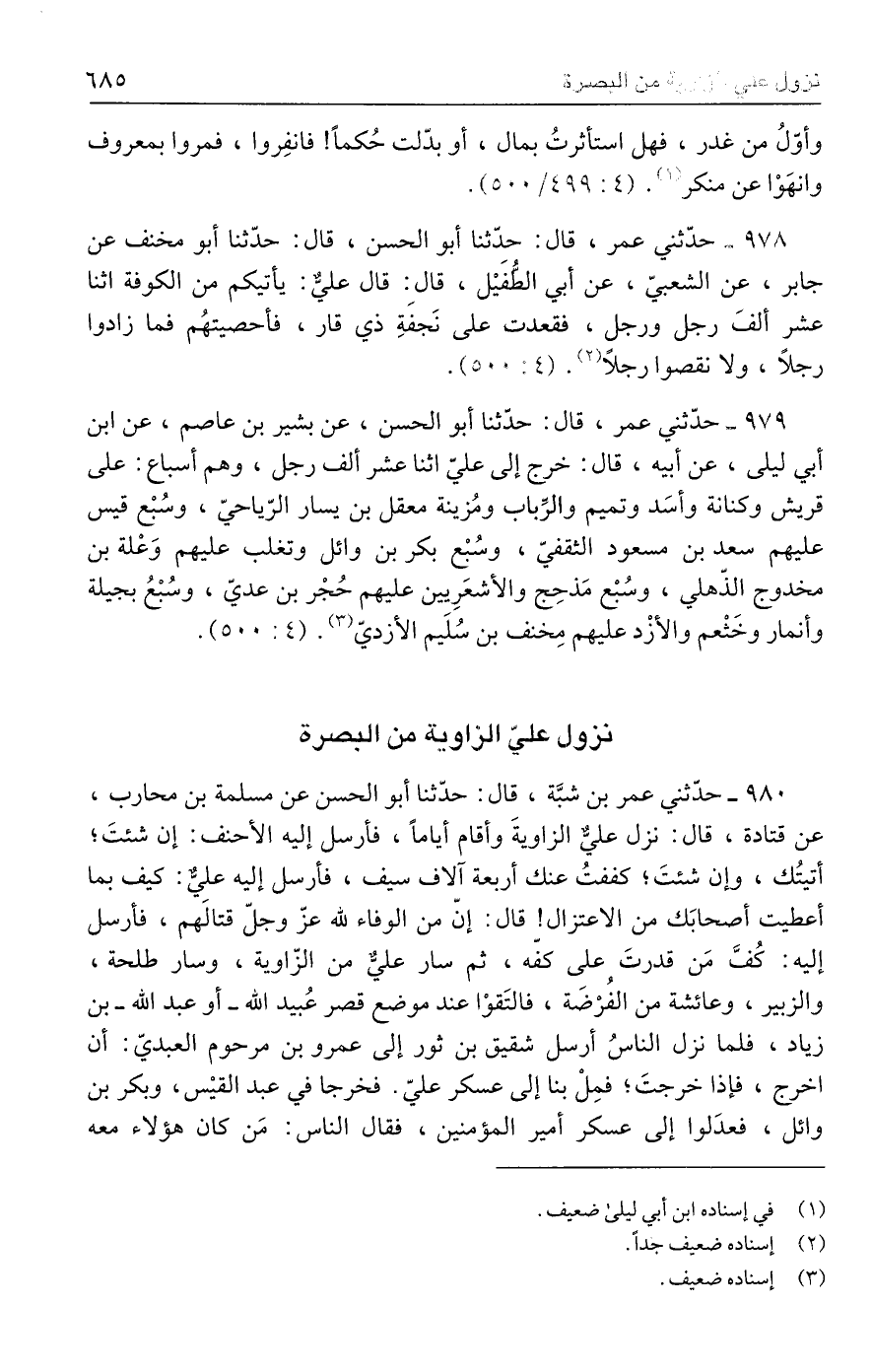 ٩٨٠ - حدّثني عمر بن شبَّة، قال: حدّثنا أبو الحسن عن مسلمة بن محارب، عن قتادة، قال: نزل عليٌّ الزاويةَ وأقام أيامًا، فأرسل إليه الأحنف: إن شئتَ؛ أتيتُك، وإن شئتَ؛ كففتُ عنك أربعة آلاف سيف، فأرسل إليه عليٌّ: كيف بما أعطيت أصحابَك من الاعتزال! قال: إنّ من الوفاء لله عزّ وجلّ قتالَهم، فأرسل إليه: كُفَّ مَن قدرتَ على كفّه، ثم سار عليٌّ من الزّاوية، وسار طلحة، والزبير، وعائشة من الفُرْضَة، فالتَقوْا عند موضع قصر عُبيد الله -أو عبد الله- بن زياد، فلما نزل الناسُ أرسل شقيق بن ثور إلى عمرو بن مرحوم العبديّ: أن اخرج، فإذا خرجتَ؛ فمِلْ بنا إلى عسكر عليّ. فخرجا في عبد القيْس، وبكر بن وائل، فعدَلوا إلى عسكر أمير المؤمنين، فقال الناس: مَن كان هؤلاء معه