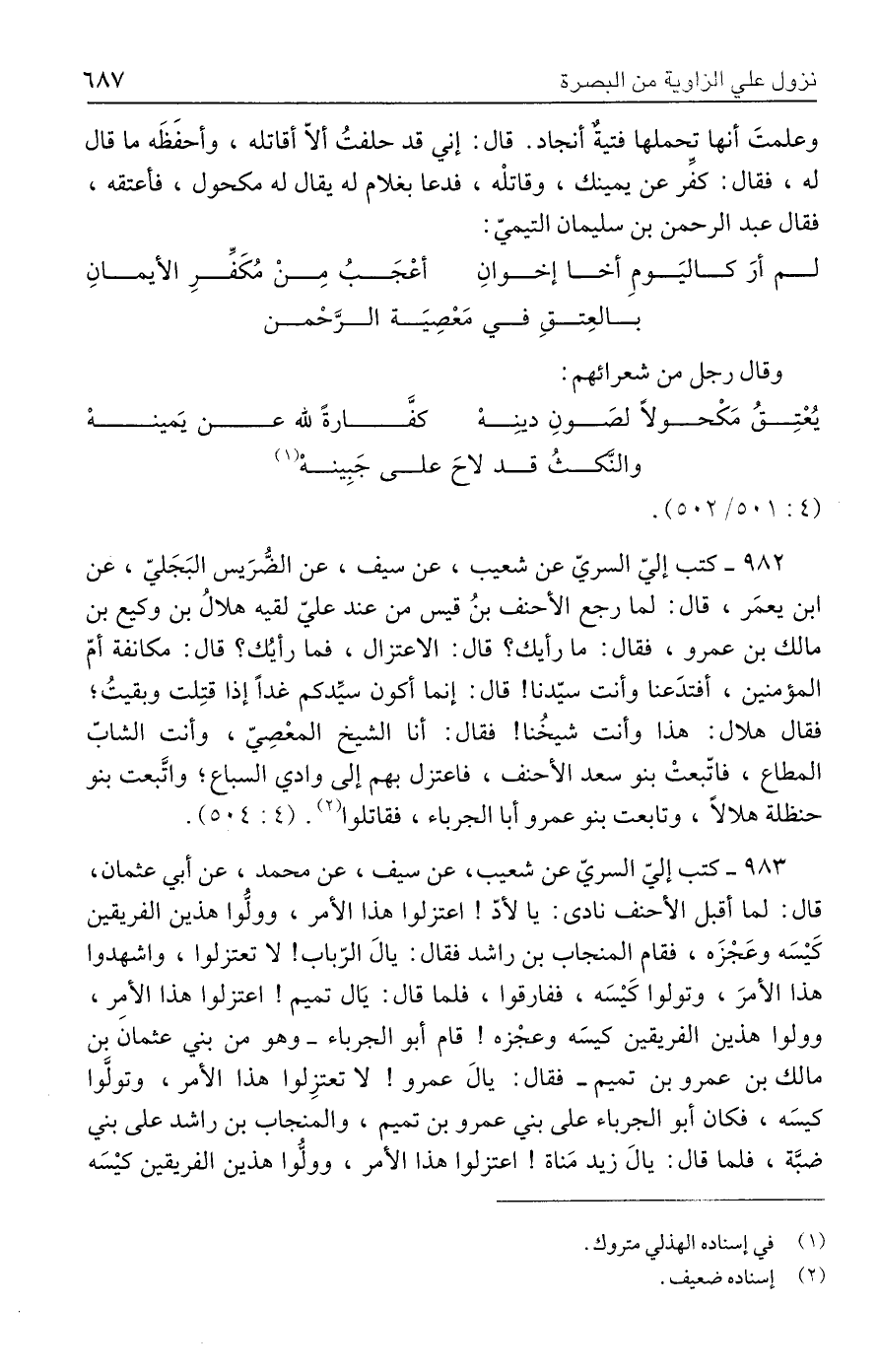٩٨٣ - كتب إليّ السريّ عن شعيب، عن سيف، عن محمد، عن أبي عثمان، قال: لما أقبل الأحنف نادى. يا لأدّ! اعتزلوا هذا الأمر، وولُّوا هذين الفريقين كَيْسَه وعَجْزَه، فقام المنجاب بن راشد فقال: يالَ الرّباب! لا تعتزلوا، واشهدوا هذا الأمرَ، وتولوا كَيْسَه، ففارقوا، فلما قال: يَال تميم! اعتزلوا هذا الأمر، وولوا هذين الفريقين كيسَه وعجْزه! قام أبو الجرباء -وهو من بني عثمان بن مالك بن عمرو بن تميم- فقال: يالَ عمرو! لا تعتزِلوا هذا الأمر، وتولَّوا كيسَه، فكان أبو الجرباء على بني عمرو بن تميم، والمنجاب بن راشد على بني ضبَّة، فلما قال: يالَ زيد مَناة! اعتزلوا هذا الأمر، وولُّوا هذين الفريقين كيْسَه