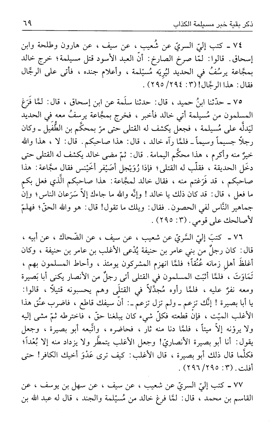 ٧٤ - كتب إليّ السريّ عن شُعيب، عن سيف، عن هارون وطلحة وابن إسحاق. قالوا: لمّا صرخ الصارخ: أنّ العبد الأسود قتل مسيلمة؛ خرج خالد بمجَّاعة يرسُفُ في الحديد ليُرِيَه مُسيلمة، وأعلام جنده، فأتى على الرجَّال فقال: هذا الرجَّال! (٣: ٢٩٤/ ٢٩٥).