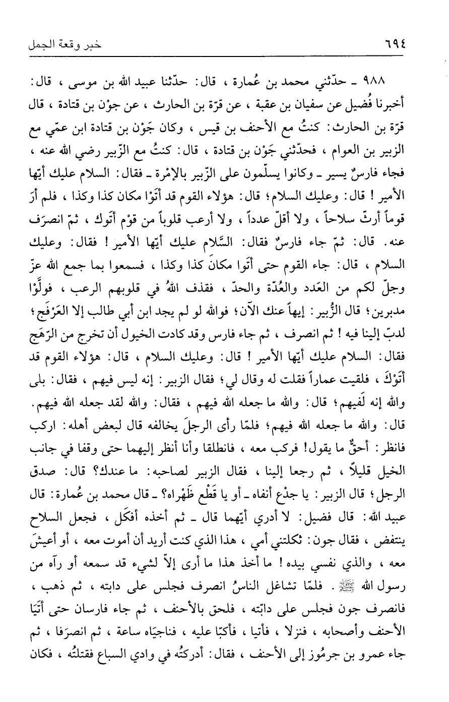 ٩٨٨ - حدّثني محمد بن عُمارة، قال: حدّثنا عبيد الله بن موسى، قال: أخبرنا فُضيل عن سفيان بن عقبة، عن قرّة بن الحارث، عن جوْن بن قتادة، قال قرّة بن الحارث: كنتُ مع الأحنف بن قيس، وكان جَوْن بن قتادة ابن عمّي مع الزبير بن العوام، فحدّثني جَوْن بن قتادة، قال: كنتُ مع الزّبير رضي الله عنه، فجاء فارسٌ يسير -وكانوا يسلّمون على الزّبير بالإمْرة- فقال: السلام عليك أيّها الأمير! قال: وعليك السلام؛ قال: هؤلاء القوم قد أتَوْا مكان كذا وكذا، فلم أرَ قومًا أرثّ سلاحًا، ولا أقلّ عددًا، ولا أرعب قلوبًا من قوْم أتَوك، ثمّ انصرَف عنه. قال: ثمّ جاء فارسٌ فقال: السَّلام عليك أيّها الأمير! فقال: وعليك السلام، قال: جاء القوم حتى أتَوا مكانَ كذا وكذا، فسمعوا بما جمع الله عزّ وجلّ لكم من العَدد والعُدّة والحدّ، فقذف اللهُ في قلوبهم الرعب، فولَّوْا مدبرين؛ قال الزُّبير: إيهًا عنك الآن؛ فوالله لو لم يجد ابن أبي طالب إلا العَرْفَج؛ لدبّ إلينا فيه! ثم انصرف، ثم جاء فارس وقد كادت الخيول أن تخرج من الرّهَج فقال: السلام عليك أيّها الأمير! قال: وعليك السلام، قال: هؤلاء القوم قد أتَوْكَ، فلقيت عمارًا فقلت له وقال لي؛ فقال الزبير: إنه ليس فيهم، فقال: بلى والله إنه لَفيهم؛ قال: والله ما جعله الله فيهم، فقال: والله لقد جعله الله فيهم. قال: والله ما جعله الله فيهم؛ فلمّا رأى الرجلَ يخالفه قال لبعض أهله: اركب فانظر: أحقٌّ ما يقول! فركب معه، فانطلقا وأنا أنظر إليهما حتى وقفا في جانب الخيل قليلًا، ثم رجعا إلينا، فقال الزبير لصاحبه: ما عندك؟ قال: صدق الرجل؛ قال الزبير: يا جدْع أنفاه - أو يا قَطْع ظَهْراه؟ - قال محمد بن عُمارة: قال عبيد الله: قال فضيل: لا أدري أيّهما قال - ثم أخذه أفكَل، فجعل السلاح ينتفض، فقال جون: ثكلتني أمي، هذا الذي كنت أريد أن أموت معه، أو أعيشَ معه، والذي نفسي بيده! ما أخذ هذا ما أرى إلّا لشيء قد سمعه أو رآه من رسول الله - صلى الله عليه وسلم -. فلمّا تشاغل الناسُ انصرف فجلس على دابته، ثم ذهب، فانصرف جون فجلس على دابّته، فلحق بالأحنف، ثم جاء فارسان حتى أتَيَا الأحنف وأصحابه، فنزلا، فأتيا، فأكبّا عليه، فناجيَاه ساعة، ثم انصرَفا، ثم جاء عمرو بن جرمُوز إلى الأحنف، فقال: أدركتُه في وادي السباع فقتلتُه، فكان