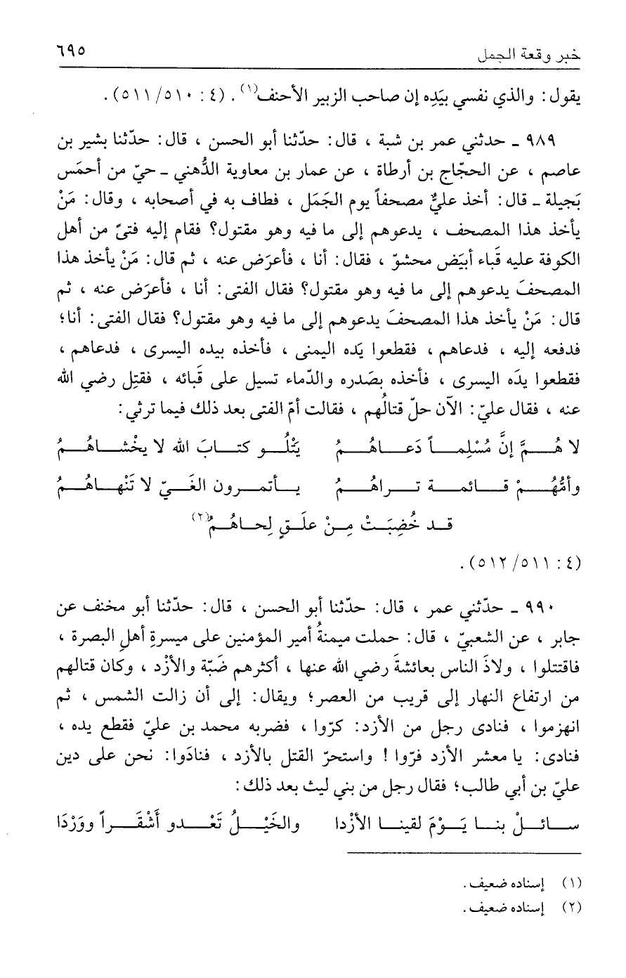 ٩٨٩ - حدثني عمر بن شبة، قال: حدّثنا أبو الحسن، قال: حدّثنا بشير بن عاصم، عن الحجّاج بن أرطاة، عن عمار بن معاوية الدُّهني -حيّ من أحمَس بَجيلة- قال: أخذ عليٌّ مصحفًا يوم الجَمَل، فطاف به في أصحابه، وقال: مَنْ يأخذ هذا المصحف، يدعوهم إلى ما فيه وهو مقتول؟ فقام إليه فتىً من أهل الكوفة عليه قَباء أبيَض محشوّ، فقال: أنا، فأعرَض عنه، ثم قال: مَنْ يأخذ هذا المصحفَ يدعوهم إلى ما فيه وهو مقتول؟ فقال الفتى: أنا، فأعرَض عنه، ثم قال: مَنْ يأخذ هذا المصحفَ يدعوهم إلى ما فيه وهو مقتول؟ فقال الفتى: أنا؛ فدفعه إليه، فدعاهم، فقطعوا يَده اليمنى، فأخذه بيده اليسرى، فدعاهم، فقطعوا يدَه اليسرى، فأخذه بصَدره والدّماء تسيل على قَبائه، فقتِل رضي الله عنه، فقال عليّ: الآن حلّ قتالُهم، فقالت أمّ الفتى بعد ذلك فيما ترثي: