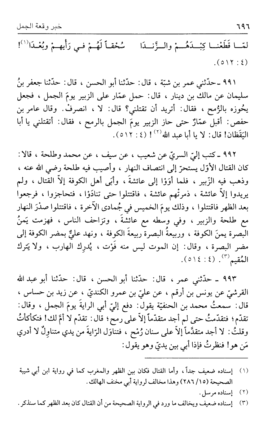 ٩٩٢ - كتب إلىَّ السريّ عن شعيب، عن سيف، عن محمد وطلحة، قالا: كان القتال الأوّل يستحرّ إلى انتصاف النهار، وأصيب فيه طلحة رضي الله عنه، وذهب فيه الزّبير، فلما أوَوْا إلى عائشةَ، وأبَى أهل الكوفة إلّا القتال، ولم يريدوا إلّا عائشة، ذمرتْهم عائشة، فاقتتلوا حتى تنادَوْا، فتحاجزوا، فرجعوا بعد الظهر فاقتتلوا، وذلك يومَ الخميس في جُمادى الآخرة، فاقتتلوا صدْرَ النهار مع طلحة والزبير، وفي وسطه مع عائشةَ، وتزاحف الناس، فهزمت يَمنُ البصرة يمنَ الكوفة، وربيعةُ البصرة ربيعةَ الكوفة، ونهد عليٌّ بمضر الكوفة إلى مضر البصرة، وقال: إن الموت ليس منه فَوْت، يُدرِك الهارب، ولا يَترك المُقيم (٣). (٤: ٥١٤).