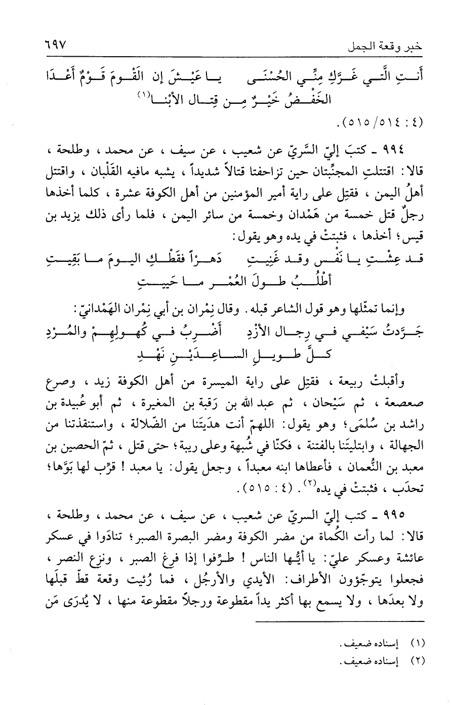 ٩٩٥ - كتب إليّ السريّ عن شعيب، عن سيف، عن محمد، وطلحة، قالا: لما رأت الكُماة من مضر الكوفة ومضر البصرة الصبر؛ تنادَوا في عسكر عائشة وعسكر عليّ: يا أيُّها الناس! طرِّفوا إذا فرغ الصبر، ونزع النصر، فجعلوا يتوجّؤون الأطراف: الأيدي والأرجُل، فما رُئيت وقعة قطّ قبلَها ولا بعدَها، ولا يسمع بها أكثر يدًا مقطوعة ورجلًا مقطوعة منها، لا يُدرَى مَن