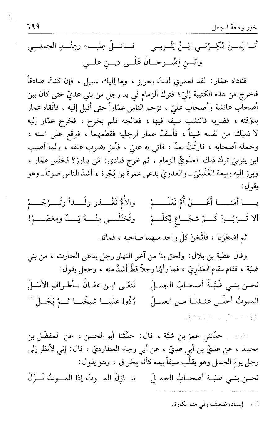 نحن بني ضَبَّةَ أصحابُ الجملْ ... نَنعَى ابن عفانَ بأطرافِ الأسَلْ