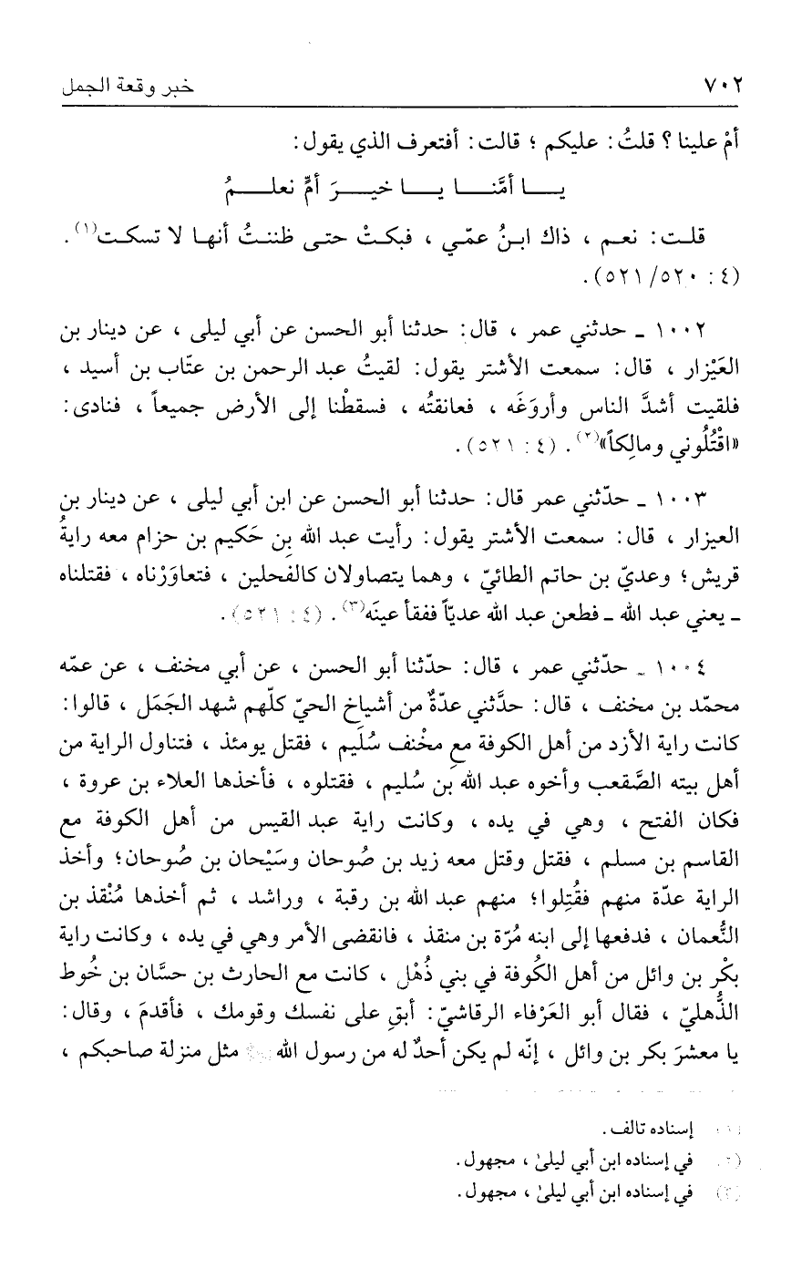 ١٠٠٤ - حدّثني عمر، قال: حدّثنا أبو الحسن، عن أبي مخنف، عن عمّه محمّد بن مخنف، قال: حدَّثني عدّةٌ من أشياخ الحيّ كلّهم شهد الجَمَل، قالوا: كانت راية الأزد من أهل الكوفة مع مخْنف سُلَيم، فقتل يومئذ، فتناول الراية من أهل بيته الصَّقعب وأخوه عبد الله بن سُليم، فقتلوه، فأخذها العلاء بن عروة، فكان الفتح، وهي في يده، وكانت راية عبد القيس من أهل الكوفة مع القاسم بن مسلم، فقتل وقتل معه زيد بن صُوحان وسَيْحان بن صُوحان؛ وأخذ الراية عدّة منهم فقُتِلوا؛ منهم عبد الله بن رقبة، وراشد، ثم أخذها مُنْقذ بن النُّعمان، فدفعها إلى ابنه مُرّة بن منقذ، فانقضى الأمر وهي في يده، وكانت راية بكْر بن وائل من أهل الكُوفة في بني ذُهْل، كانت مع الحارث بن حسَّان بن خُوط الذُّهليّ، فقال أبو العَرْفاء الرقاشيّ: أبقِ على نفسك وقومك، فأقدمَ، وقال: يا معشرَ بكر بن وائل، إنّه لم يكن أحدٌ له من رسول الله - صلى الله عليه وسلم - مثل منزلة صاحبكم،