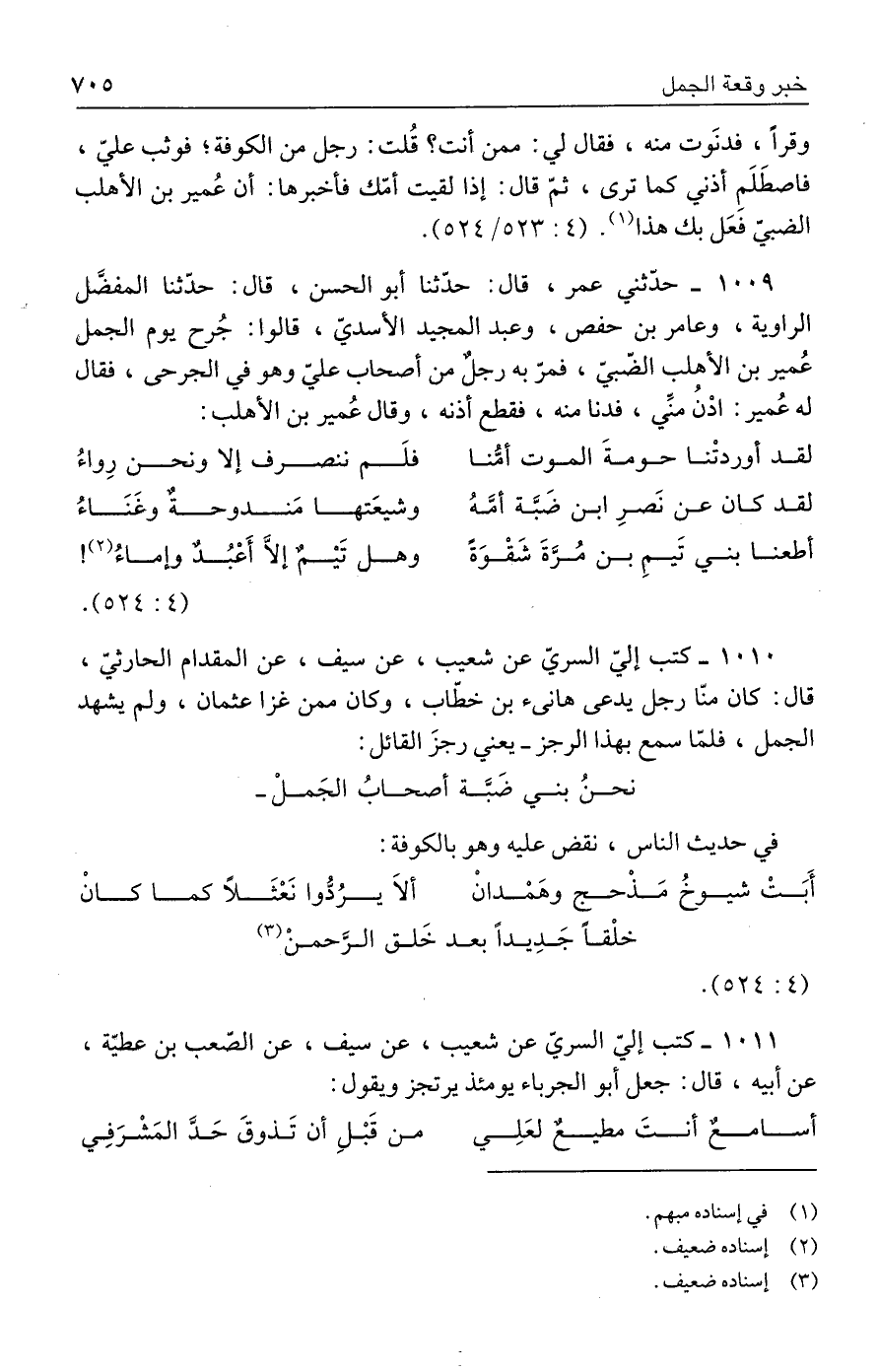 ١٠١٠ - كتب إليّ السريّ عن شعيب، عن سيف، عن المقدام الحارثيّ، قال: كان منّا رجل يدعى هانئ بن خطّاب، وكان ممن غزا عثمان، ولم يشهد الجمل، فلمّا سمع بهذا الرجز- يعني رجزَ القائل: