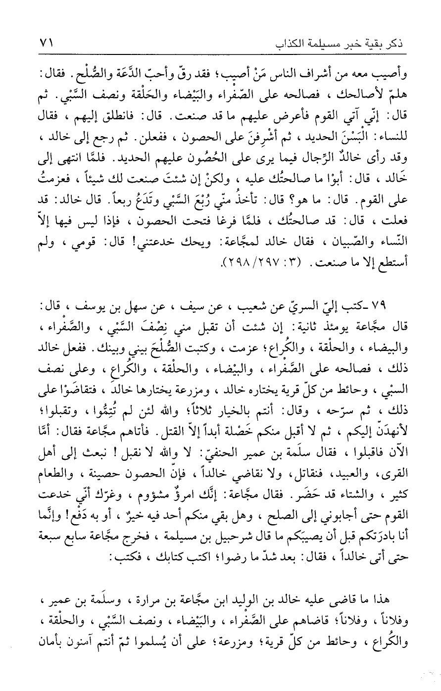 ٧٩ - كتب إليّ السريّ عن شعيب، عن سيف، عن سهل بن يوسف، قال: قال مجَّاعة يومئذ ثانية: إن شئت أن تقبل مني نِصْفَ السَّبْي، والصَّفْراء، والبيضاء، والحلْقة، والكُراع؛ عزمت، وكتبت الصُّلْحَ بيني وبينك. ففعل خالد ذلك، فصالحه على الصَّفْراء، والبيضاء، والحلْقة، والكُراع، وعلى نصف السبْي، وحائط من كلّ قرية يختاره خالد، ومزرعة يختارها خالدَ، فتقاضَوْا على ذلك، ثم سرّحه، وقال: أنتم بالخيار ثلاثًا؛ والله لئن لم تُتِمُّوا، وتقبلوا؛ لأنهدَنّ إليكم، ثم لا أقبل منكم خَصْلة أبدًا إلّا القتل. فأتاهم مجَّاعة فقال: أمَّا الآن فاقبلوا، فقال سلَمة بن عمير الحنفيّ: لا والله لا نقبل! نبعث إلى أهل القرى، والعبيد، فنقاتل، ولا نقاضي خالدًا، فإنّ الحصون حصينة، والطعام كثير، والشتاء قد حَضر. فقال مجَّاعة: إنَّك امرؤٌ مشؤوم، وغرّك أنّي خدعت القوم حتى أجابوني إلى الصلح، وهل بقي منكم أحد فيه خيرٌ، أو به دَفْع! وإنَّما أنا بادرَتكم قبل أن يصيبَكم ما قال شرحبيل بن مسيلمة، فخرج مجَّاعة سابع سبعة حتى أتى خالدًا، فقال: بعد شدّ ما رضوا؛ اكتب كتابك، فكتب: