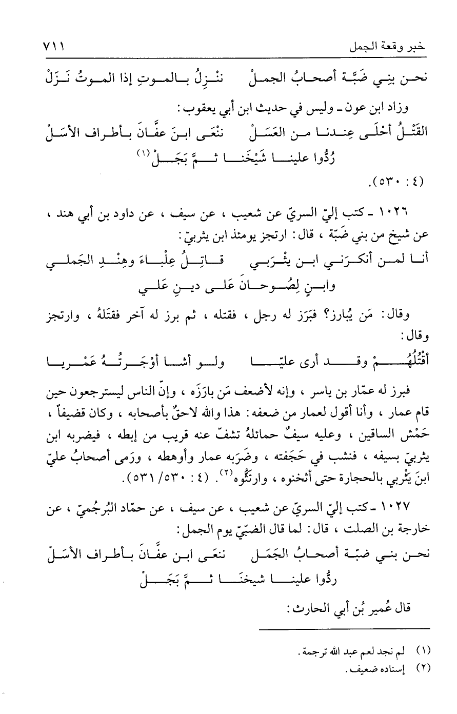 ١٠٢٧ - كتب إليّ السريّ عن شعيب، عن سيف، عن حمّاد البُرجُميّ، عن خارجة بن الصلت، قال: لما قال الضبّيّ يوم الجمل: