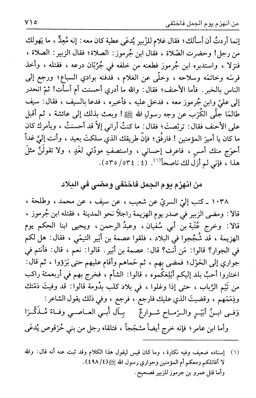 ١٠٣٨ - كتب إليّ السرىّ عن شعيب، عن سيف، عن محمد، وطلحة، قالا: ومضى الزبير في صدر يوم الهزيمة راجلًا نحو المدينة، فقتله ابن جُرموز، قالا: وخرج عُتْبة بن أبي سُفيان، وعبدُ الرحمن، ويحيى ابنا الحكم يوم الهزيمة، قد شُجِّجوا في البلاد، فلقوا عصمة بن أبَير التيمّي، فقال: هل لكم في الجوار؟ قالوا: مَن أنت؟ قال: عصمة بن أبَير. قالوا: نعم، قال: فأنتم في جواري إلى الحَوْل؛ فمضى بهم، ثم حَماهم وأقام عليهم حتى بَرَؤوا، ثم قال: اختاروا أحبَّ بلد إليكم أبْلِغكُموه، قالوا: الشام، فخرج بهم في أربعمئة راكب من تَيْم الرِّباب، حتى إذا وغلوا، في بلاد كلب بدُومة قالوا: قد وفيتَ ذمّتك وذِمَمَهم، وقضيتَ الذي عليك فارجع، فرجع، وفي ذلك يقول الشاعر: