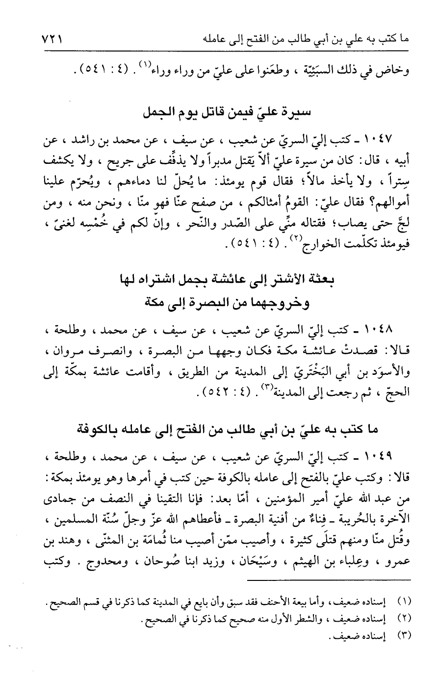 ١٠٤٨ - كتب إلىّ السريّ عن شعيب، عن سيف، عن محمد، وطلحة، قالا: قصدتْ عائشة مكة فكان وجهها من البصرة، وانصرف مروان، والأسوَد بن أبي البَخْتَريّ إلى المدينة من الطريق، وأقامت عائشة بمكّة إلى الحجّ، ثم رجعت إلى المدينة (٣). (٤: ٥٤٢).