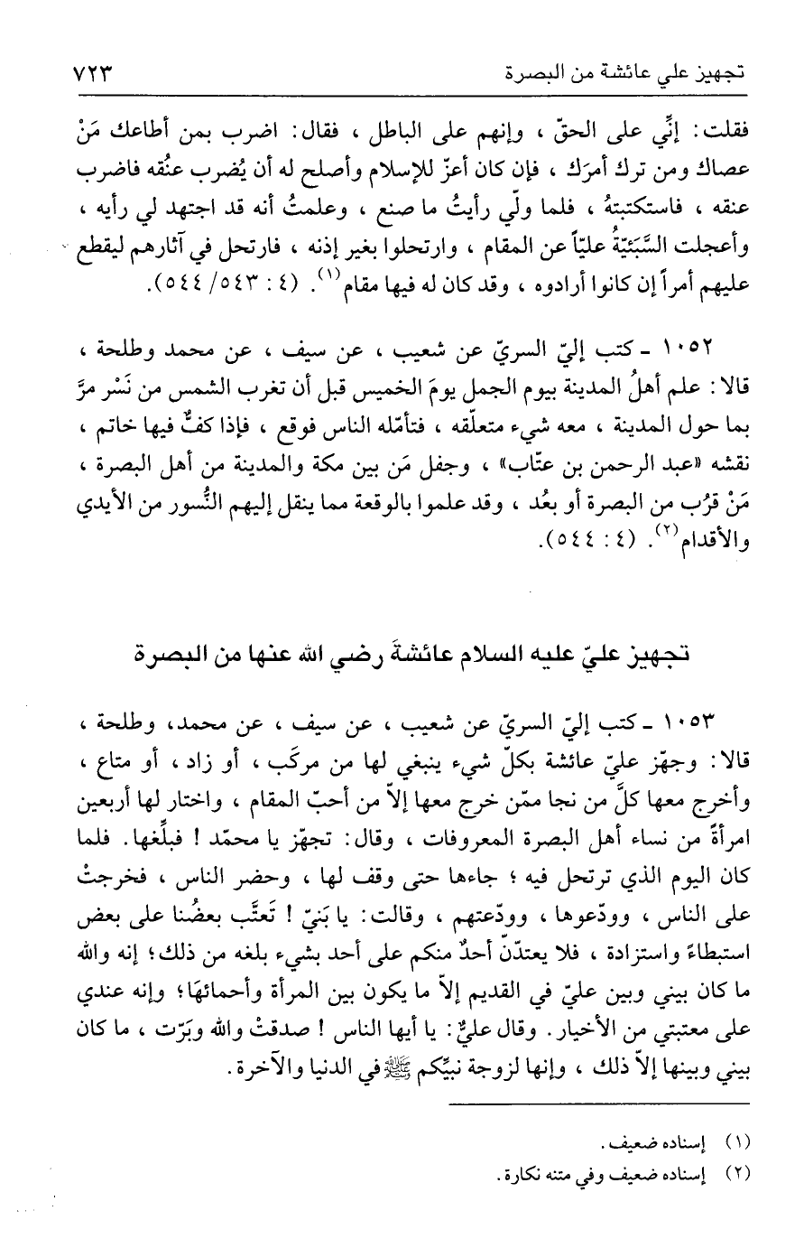 ١٠٥٣ - كتب إليّ السريّ عن شعيب، عن سيف، عن محمد، وطلحة، قالا: وجهّز عليّ عائشة بكلّ شيء ينبغي لها من مركَب، أو زاد، أو متاع، وأخرج معها كلَّ من نجا ممّن خرج معها إلّا من أحبّ المقام، واختار لها أربعين امرأةً من نساء أهل البصرة المعروفات، وقال: تجهّز يا محمّد! فبلِّغها. فلما كان اليوم الذي ترتحل فيه؛ جاءها حتى وقف لها، وحضر الناس، فخرجتْ على الناس، وودّعوها، وودّعتهم، وقالت: يا بَنيّ! تَعتَّب بعضُنا على بعض استبطاءً واستزادة، فلا يعتدّنّ أحدٌ منكم على أحد بشيء بلغه من ذلك؛ إنه والله ما كان بيني وبين عليّ في القديم إلّا ما يكون بين المرأة وأحمائهَا؛ وإنه عندي على معتبتي من الأخيار. وقال عليٌّ: يا أيها الناس! صدقتْ والله وبَرّت، ما كان بيني وبينها إلّا ذلك، وإنها لزوجة نبيِّكم - صلى الله عليه وسلم - في الدنيا والآخرة.