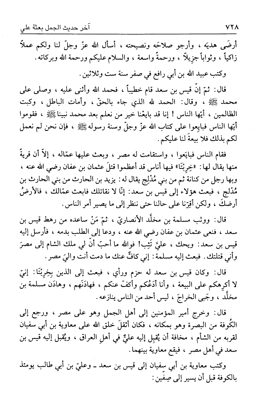 قال: وخرج أمير المؤمنين إلى أهل الجمل وهو على مصر، ورجع إلى الكُوفة من البصرة وهو بمكانه، فكان أثقلَ خلق الله على معاوية بن أبي سفيان لقربه من الشام، مخافة أن يُقبِل إليه عليٌّ في أهلِ العراق، ويُقبل إليه قيس بن سعد في أهل مصر، فيقع معاوية بينهما.