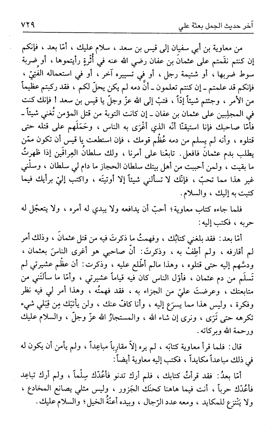 أمّا بعد: فقد بلغني كتابُك، وفهمتُ ما ذكرتَ فيه من قتل عثمانَ، وذلك أمر لم أقارفه، ولم أطِفْ به، وذكرتَ: أنّ صاحبي هو أغرى الناسَ بعثمان، ودسَّهم إليه حتى قتلوه، وهذا مالم أطّلع عليه، وذكرت: أن عظْم عشيرتي لم تَسلَم من دم عثمان، فأوّل الناس كان فيه قيامًا عشيرتي، وأمّا ما سألتَني من متابعتك، وعرضتَ عليّ من الجزاء به، فقد فهمتُه، وهذا أمر لي فيه نظر وفكرة، وليس هذا مما يسرَع إليه، وأنا كافّ عنك، ولن يأتيَك مِن قِبَلي شيء تكرهه حتى تَرَى، ونرى إن شاء الله، والمستجارُ الله عزّ وجلّ، والسلام عليك ورحمة الله وبركاته.