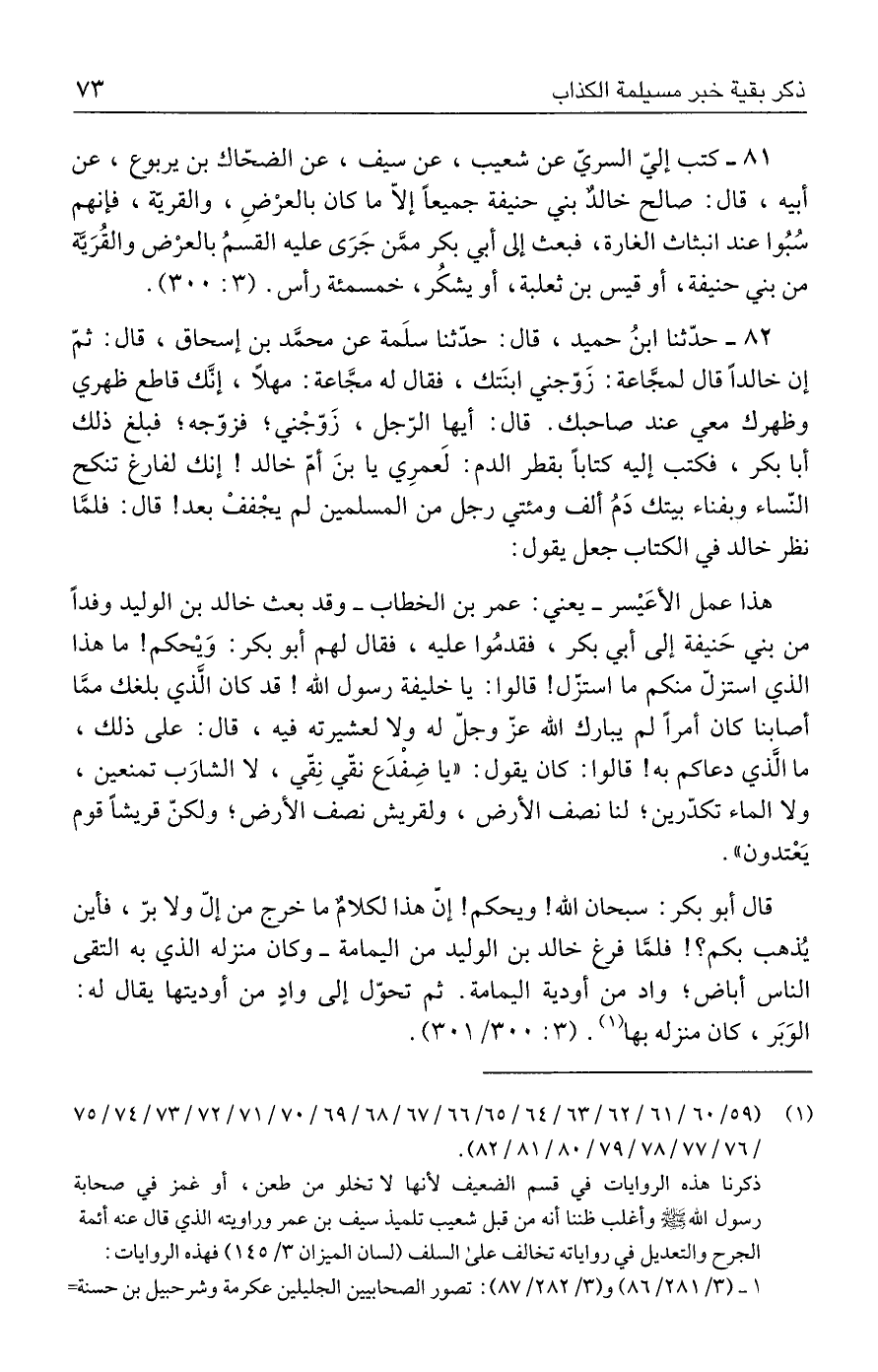 ٨١ - كتب إليّ السريّ عن شعيب، عن سيف، عن الضحّاك بن يربوع، عن أبيه، قال: صالح خالدٌ بني حنيفة جميعًا إلّا ما كان بالعرْضِ، والقريّة، فإنهم سُبُوا عند انبثاث الغارة، فبعث إلى أبي بكر ممَّن تجرَى عليه القسمُ بالعرْض والقُرَيّة من بني حنيفة، أو قيس بن ثعلبة، أو يشكُر، خمسمئة رأس. (٣: ٣٠٠).
