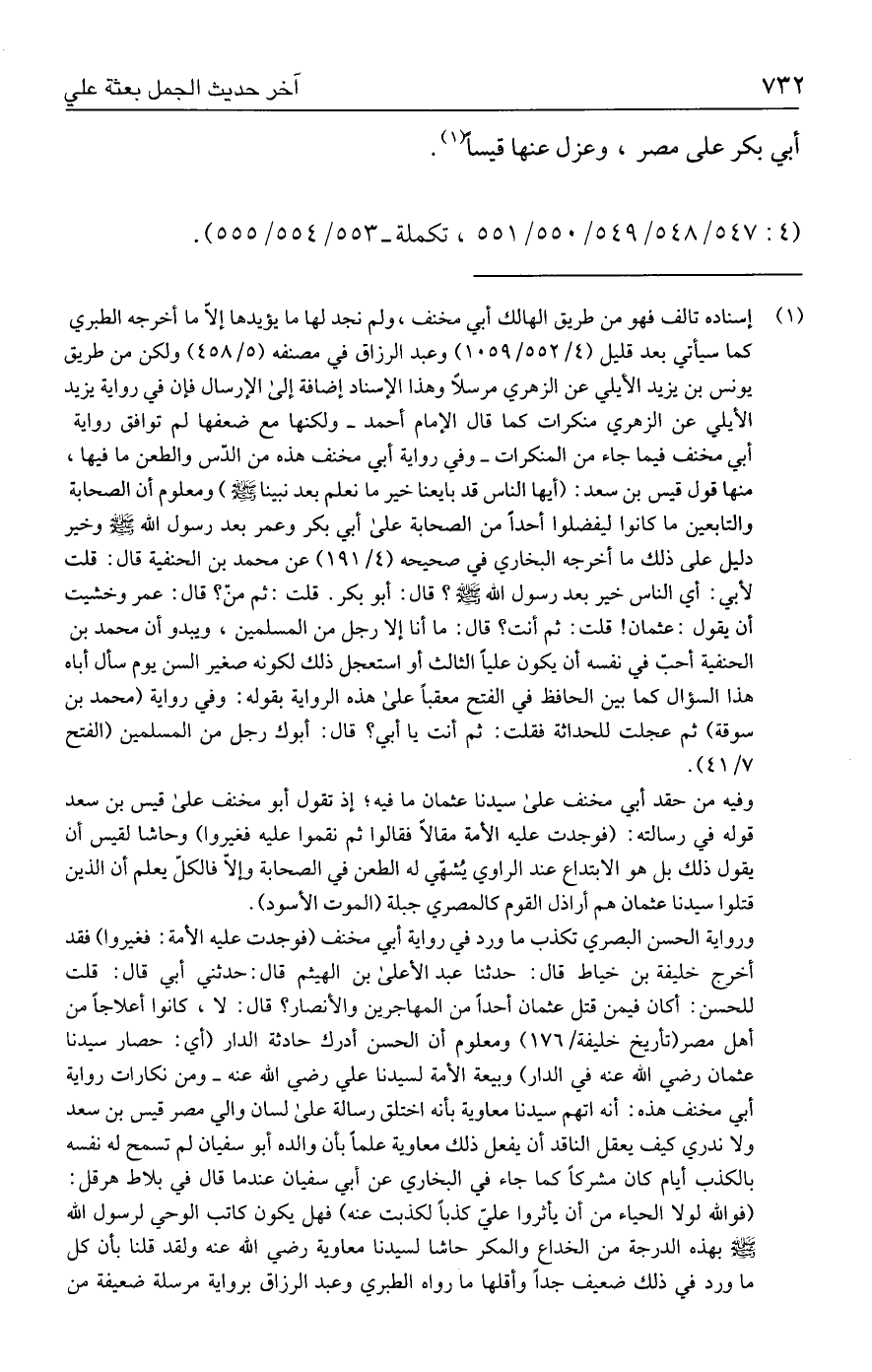 ورواية الحسن البصري تكذب ما ورد في رواية أبي مخنف (فوجدت عليه الأمة: فغيروا) فقد أخرج خليفة بن خياط قال: حدثنا عبد الأعلى بن الهيثم قال: حدثني أبي قال: قلت للحسن: أكان فيمن قتل عثمان أحدًا من المهاجرين والأنصار؟ قال: لا، كانوا أعلاجًا من أهل مصر (تأريخ خليفة/ ١٧٦) ومعلوم أن الحسن أدرك حادثة الدار (أي: حصار سيدنا عثمان رضي الله عنه في الدار) وبيعة الأمة لسيدنا علي رضي الله عنه- ومن نكارات رواية أبي مخنف هذه: أنه اتهم سيدنا معاوية بأنه اختلق رسالة على لسان والي مصر قيس بن سعد ولا ندري كيف يعقل الناقد أن يفعل ذلك معاوية علمًا بأن والده أبو سفيان لم تسمح له نفسه بالكذب أيام كان مشركًا كما جاء في البخاري عن أبي سفيان عندما قال في بلاط هرقل: (فوالله لولا الحياء من أن يأثروا عليّ كذبًا لكذبت عنه) فهل يكون كاتب الوحي لرسول الله - صلى الله عليه وسلم - بهذه الدرجة من الخداع والمكر حاشا لسيدنا معاوية رضي الله عنه ولقد قلنا بأن كل ما ورد في ذلك ضعيف جدًّا وأقلها ما رواه الطبري وعبد الرزاق برواية مرسلة ضعيفة من =