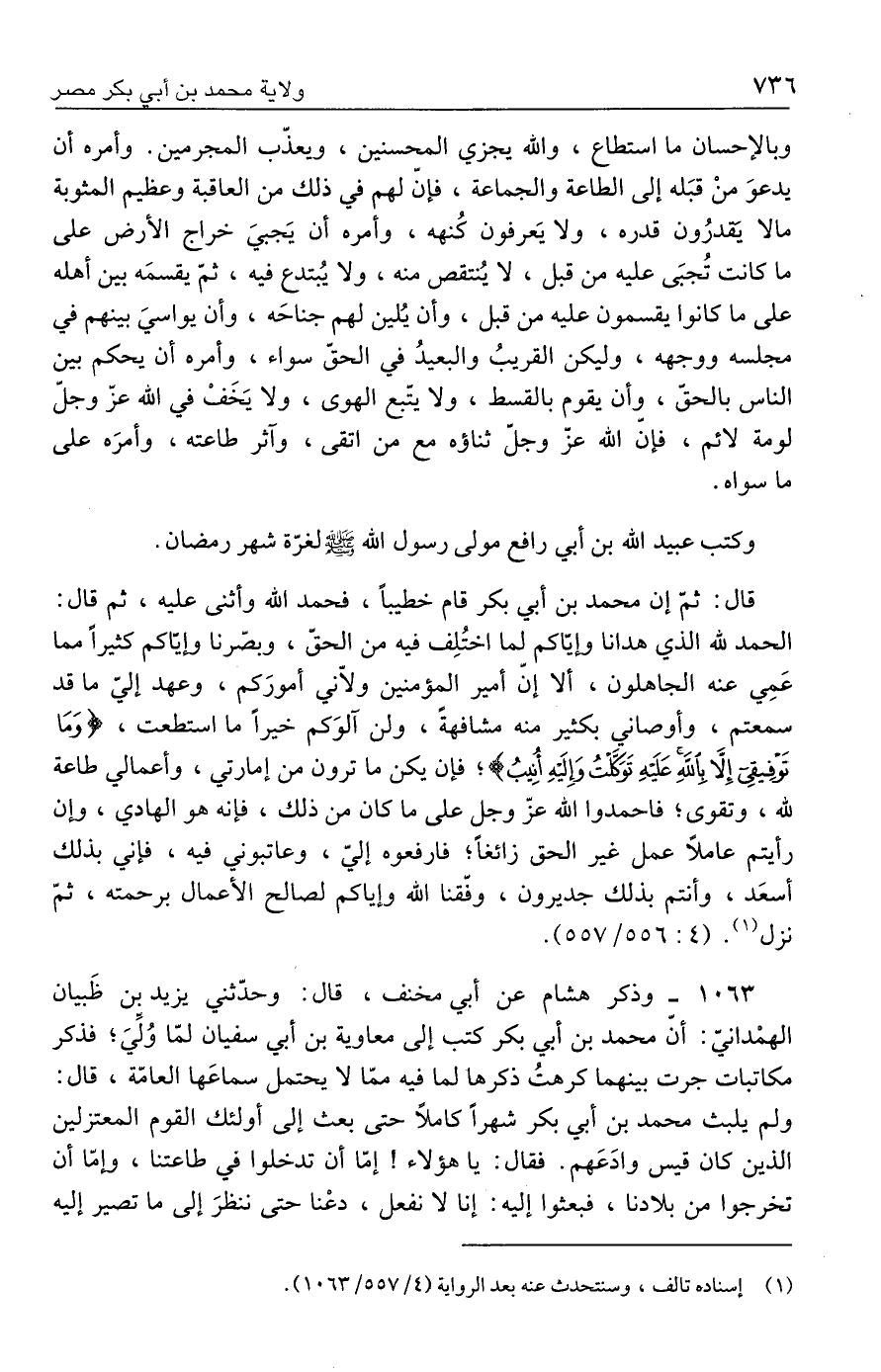 ١٠٦٣ - وذكر هشام عن أبي مخنف، قال: وحدّثني يزيد بن ظَبيان الهمْدانيّ: أنّ محمد بن أبي بكر كتب إلى معاوية بن أبي سفيان لمّا وُلِّيَ؛ فذكر مكاتبات جرت بينهما كرهتُ ذكرها لما فيه ممّا لا يحتمل سماعَها العامّة، قال: ولم يلبث محمد بن أبي بكر شهرًا كاملًا حتى بعث إلى أولئك القوم المعتزلين الذين كان قيس وادَعَهم. فقال: يا هؤلاء! إمّا أن تدخلوا في طاعتنا، وإمّا أن تخرجوا من بلادنا، فبعثوا إليه: إنا لا نفعل، دعْنا حتى ننظرَ إلى ما تصير إليه