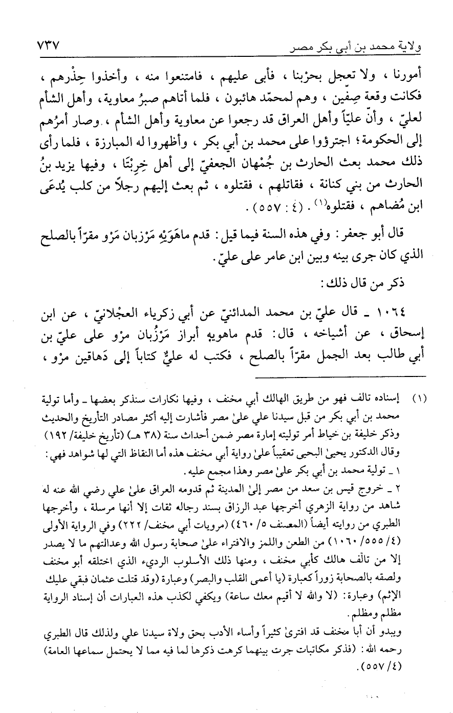 (١) إسناده تالف فهو من طريق الهالك أبي مخنف، وفيها نكارات سنذكر بعضها -وأما تولية محمد بن أبي بكر من قبل سيدنا عليّ على مصر فأشارت إليه أكثر مصادر التأريخ والحديث وذكر خليفة بن خياط أمر توليته إمارة مصر ضمن أحداث سنة (٣٨ هـ) (تأريخ خليفة/ ١٩٢) وقال الدكتور يحيى البحيى تعقيبًا على رواية أبي مخنف هذه أما النقاظ التي لها شواهد فهي: