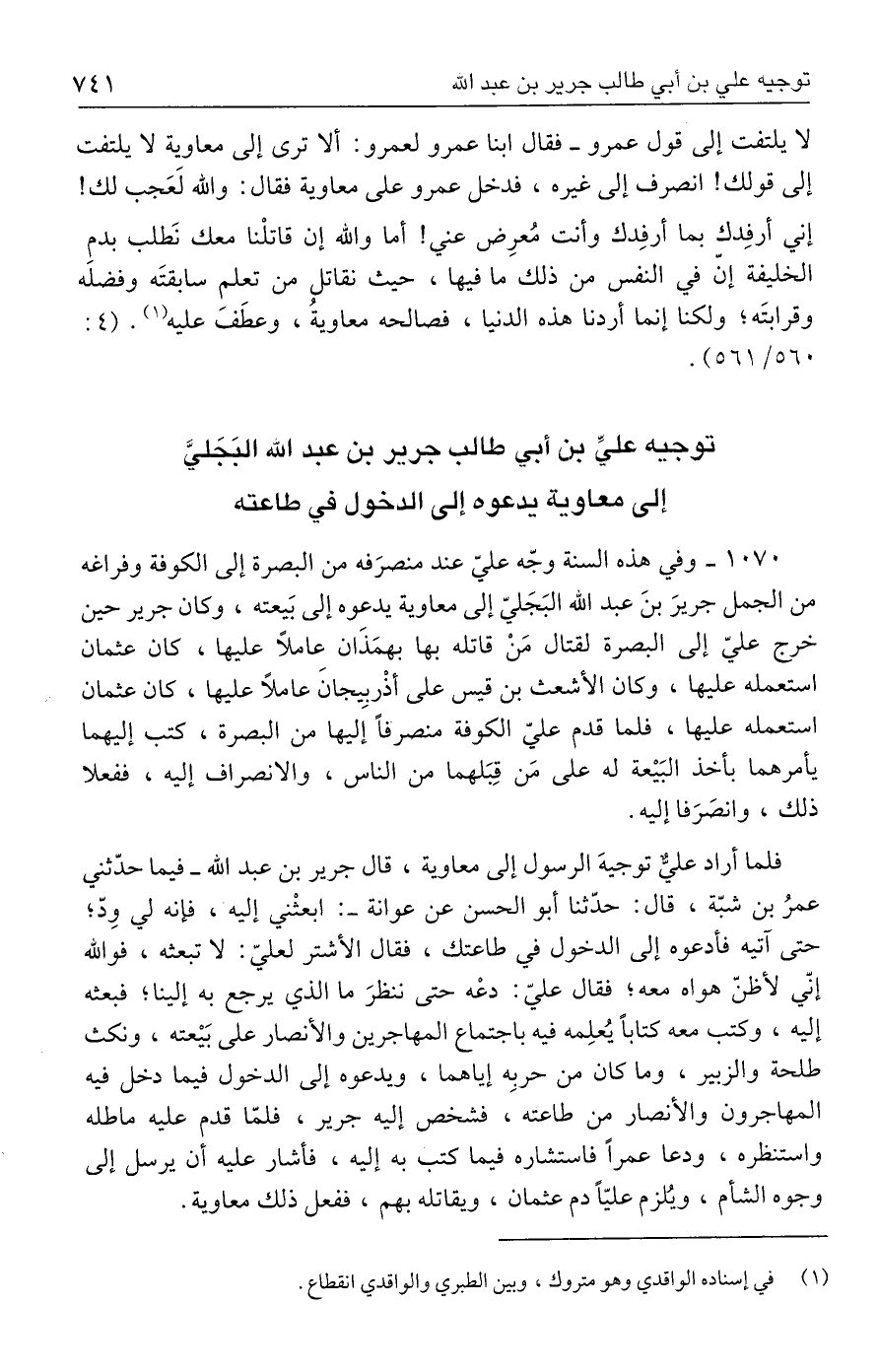 ١٠٧٠ - وفي هذه السنة وجّه عليّ عند منصرَفه من البصرة إلى الكوفة وفراغه من الجمل جريرَ بنَ عبد الله البَجَليّ إلى معاوية يدعوه إلى بَيعته، وكان جرير حين خرج عليّ إلى البصرة لقتال مَنْ قاتله بها بهمَذَان عاملًا عليها، كان عثمان استعمله عليها، وكان الأشعث بن قيس على أذْربِيجانَ عاملًا عليها، كان عثمان استعمله عليها، فلما قدم عليّ الكوفة منصرفًا إليها من البصرة، كتب إليهما يأمرهما بأخذ البَيْعة له على مَن قِبَلهما من الناس، والانصراف إليه، ففعلا ذلك، وانصَرَفا إليه.