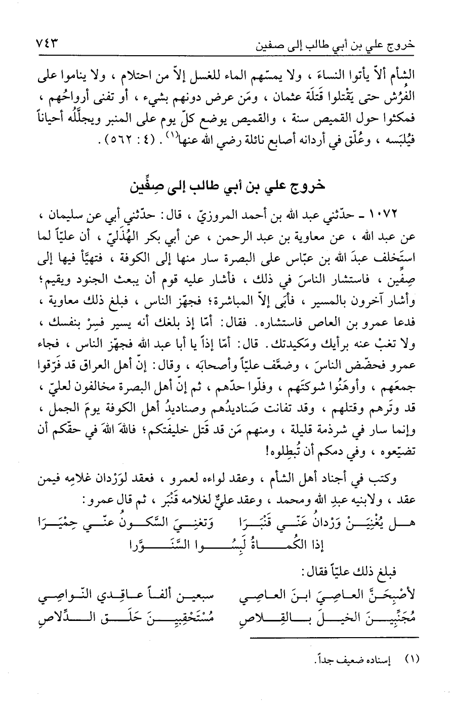 ١٠٧٢ - حدّثني عبد الله بن أحمد المروزيّ، قال: حدّثني أبي عن سليمان، عن عبد الله، عن معاوية بن عبد الرحمن، عن أبي بكر الهُذَليّ، أن عليًّا لما استَخلف عبدَ الله بن عبّاس على البصرة سار منها إلى الكوفة، فتهيَّأ فيها إلى صِفِّين، فاستشار الناسَ في ذلك، فأشار عليه قوم أن يبعث الجنود ويقيم؛ وأشار آخرون بالمسير، فأبَى إلّا المباشرة؛ فجهّز الناس، فبلغ ذلك معاوية، فدعا عمرو بن العاص فاستشاره. فقال: أمّا إذ بلغك أنه يسير فسِرْ بنفسك، ولا تغبْ عنه برأيك ومَكيدتك. قال: أمّا إذًا يا أبا عبد الله فجهّز الناس، فجاء عمرو فحضّض الناسَ، وضعَّف عليًّا وأصحابَه، وقال: إنّ أهل العراق قد فَرّقوا جمعَهم، وأوهَنُوا شوكتَهم، وفلّوا حدّهم، ثم إنّ أهل البصرة مخالفون لعليّ، قد وتَرهم وقتلهم، وقد تفانت صَناديدُهم وصناديدُ أهل الكوفة يومَ الجمل، وإنما سار في شرذمة قليلة، ومنهم مَن قد قَتل خليفَتكم؛ فاللهَ اللهَ في حقّكم أن تضيّعوه، وفي دمكم أن تُبطِلوه!