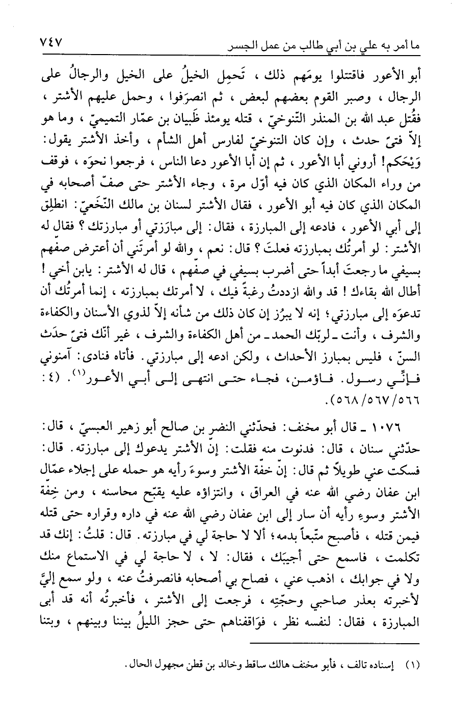 ١٠٧٦ - قال أبو مخنف: فحدّثني النضر بن صالح أبو زهير العبسيّ، قال: حدّثني سنان، قال: فدنوت منه فقلت: إن الأشتر يدعوك إلى مبارزته. قال: فسكت عني طويلًا ثم قال: إنّ خفّة الأشتر وسوءَ رأيه هو حمله على إجلاء عمّال ابن عفان رضي الله عنه في العراق، وانتزاؤه عليه يقبّح محاسنه، ومن خِفّة الأشتر وسوءِ رأيه أن سار إلى ابن عفان رضي الله عنه في داره وقراره حتى قتله فيمن قتله، فأصبح متّبعًا بدمه؛ ألا لا حاجة لي في مبارزته. قال: قلتُ: إنك قد تكلمت، فاسمع حتى أجيبَك، فقال: لا، لا حاجة لي في الاستماع منك ولا في جوابك، اذهب عني، فصاح بي أصحابه فانصرفتُ عنه، ولو سمع إليَّ لأخبرته بعذر صاحبي وحجّتِه، فرجعت إلى الأشتر، فأخبرتُه أنه قد أبى المبارزة، فقال: لنفسه نظر، فوَاقفناهم حتى حجز الليلُ بيننا وبينهم، وبتنا