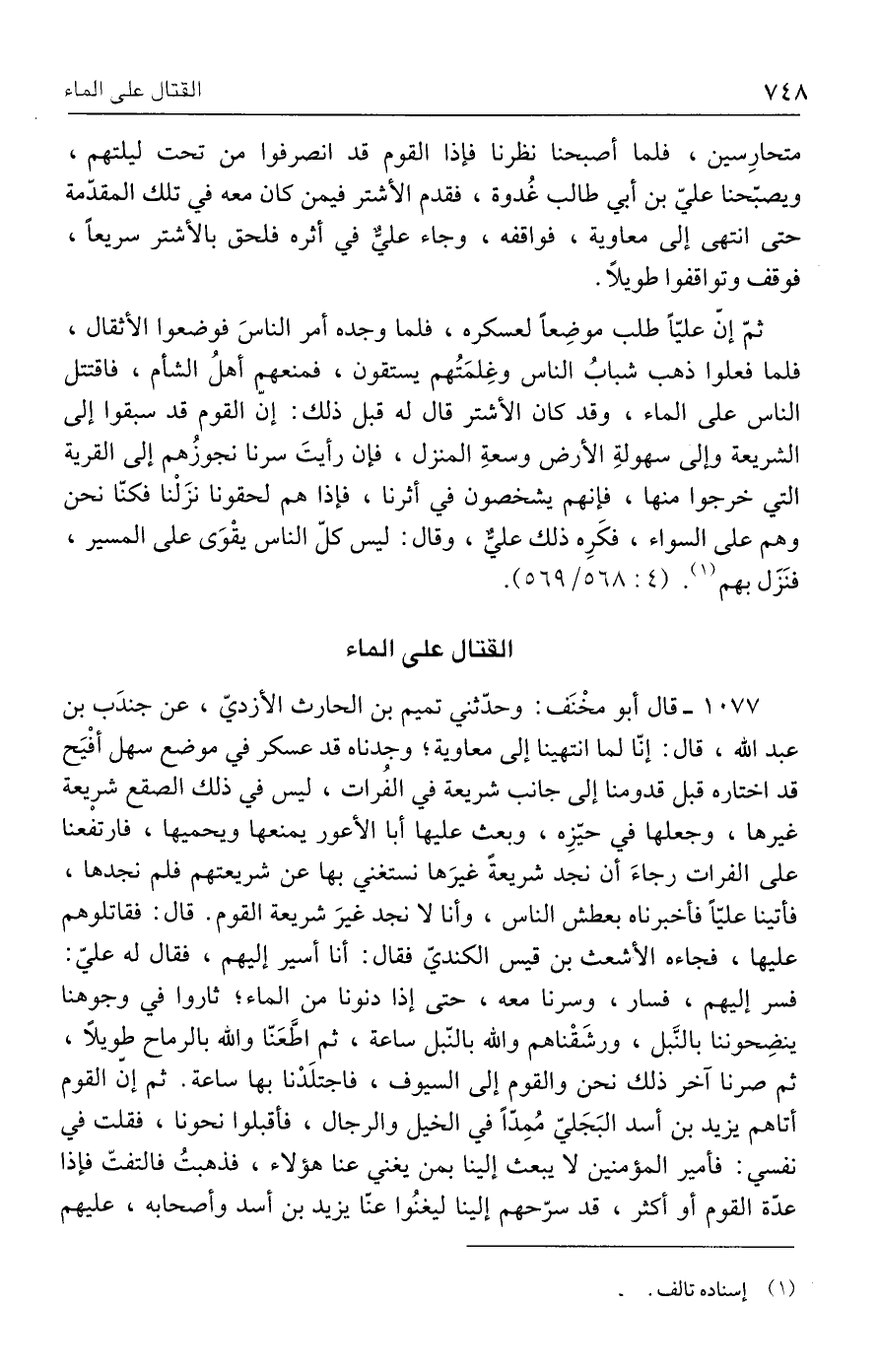 ١٠٧٧ - قال أبو مخْنَف: وحدّثني تميم بن الحارث الأزديّ، عن جندَب بن عبد الله، قال: إنّا لما انتهينا إلى معاوية؛ وجدناه قد عسكر في موضع سهل أفْيَح قد اختاره قبل قدومنا إلى جانب شريعة في الفُرات، ليس في ذلك الصقع شريعة غيرها، وجعلها في حيّزِه، وبعث عليها أبا الأعور يمنعها ويحميها، فارتفْعنا على الفرات رجاءَ أن نجد شريعة غيرَها نستغني بها عن شريعتهم فلم نجدها، فأتينا عليًّا فأخبرناه بعطش الناس، وأنا لا نجد غيرَ شريعة القوم. قال: فقاتلوهم عليها، فجاءه الأشعث بن قيس الكنديّ فقال: أنا أسير إليهم، فقال له عليّ: فسر إليهم، فسار، وسرنا معه، حتى إذا دنونا من الماء؛ ثاروا في وجوهنا ينضِحوننا بالنَّبل، ورشَقْناهم والله بالنّبل ساعة، ثم اطَّعَنّا والله بالرماح طويلًا، ثم صرنا آخر ذلك نحن والقوم إلى السيوف، فاجتلَدْنا بها ساعة. ثم إنّ القوم أتاهم يزيد بن أسد البَجَليّ مُمِدًّا في الخيل والرجال، فأقبلوا نحونا، فقلت في نفسي: فأمير المؤمنين لا يبعث إلينا بمن يغني عنا هؤلاء، فذهبتُ فالتفتّ فإذا عدّة القوم أو أكثر، قد سرّحهم إلينا ليغنُوا عنّا يزيد بن أسد وأصحابه، عليهم