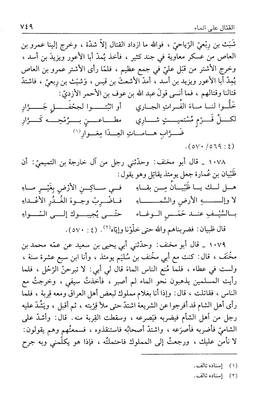 ١٠٧٩ - قال أبو مخنف: وحدّثني أبي يحيى بن سعيد عن عمّه محمد بن مخْنَف، قال: كنت مع أبي مخْنف بن سُليَم يومئذ، وأنا ابن سبع عشرة سنة، ولست في عطاء، فلما مُنع الناس الماءَ قال لي أبي: لا تبرحنّ الرّحْل، فلما رأيت المسلمين يذهبون نحو الماء لم أصبر، فأخذتُ سيفي، وخرجتُ مع الناس، فقاتلت، قال: وإذا أنا بغلام مملوك لبعض أهل العراق ومعه قِربة، فلما رأى أهل الشام قد أفرجوا عن الشريعة اشتدّ حتى ملأ قِرْبته، ثم أقبل، ويَشُدّ عليه رجل من أهل الشام فيضربه فيَصرعه، وسقطت القِربة منه. قال: وأشدّ على الشاميّ فأضربه فأصرَعه، واشتدّ أصحابُه فاستنقذوه، فسمعتُهم وهم يقولون: لا نأمن عليك، ورجعتُ إلى المملوك فاحتملتُه، فإذا هو يكلّمني وبه جرح