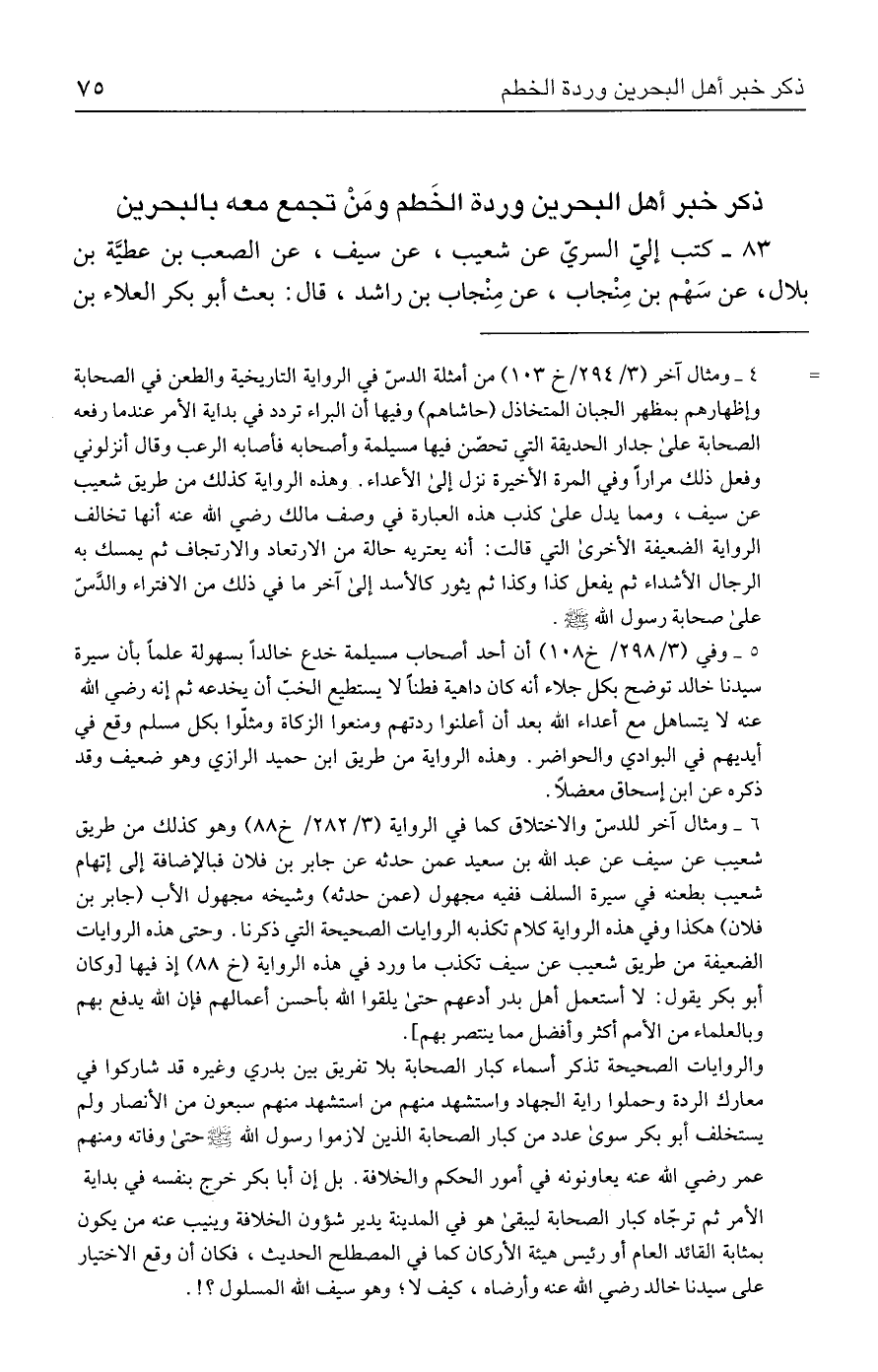 = ٤ - ومثال آخر (٣/ ٢٩٤ / خ ١٠٣) من أمثلة الدسّ في الرواية التاريخية والطعن في الصحابة وإظهارهم بمظهر الجبان المتخاذل (حاشاهم) وفيها أن البراء تردد في بداية الأمر عندما رفعه الصحابة على جدار الحديقة التي تحصّن فيها مسيلمة وأصحابه فأصابه الرعب وقال أنزلوني وفعل ذلك مرارًا وفي المرة الأخيرة نزل إلى الأعداء. وهذه الرواية كذلك من طريق شعيب عن سيف، ومما يدل على كذب هذه العبارة في وصف مالك رضي الله عنه أنها تخالف الرواية الضعيفة الأخرى التي قالت: أنه يعتريه حالة من الارتعاد والارتجاف ثم يمسك به الرجال الأشداء ثم يفعل كذا وكذا ثم يثور كالأسد إلى آخر ما في ذلك من الافتراء والدَّسّ على صحابة رسول الله - صلى الله عليه وسلم -.
