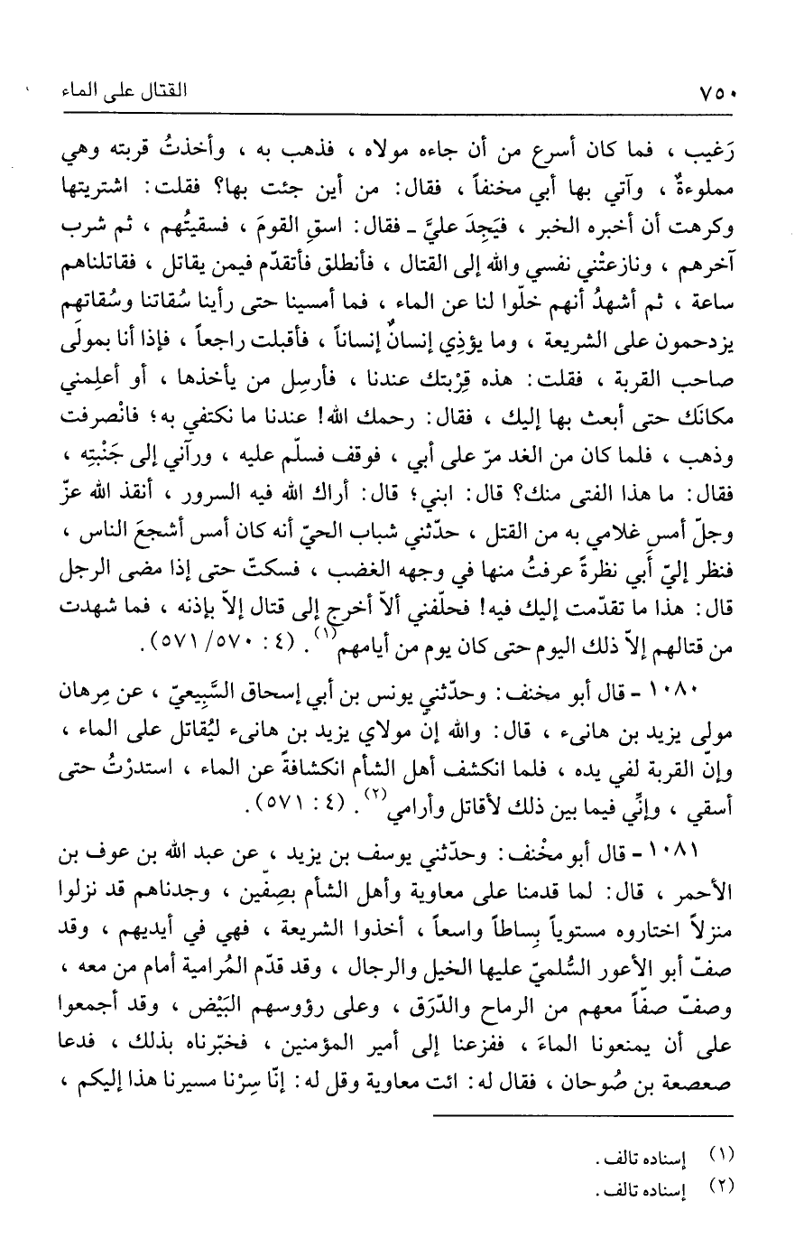 ١٠٨٠ - قال أبو مخنف: وحدّثني يونس بن أبي إسحاق السَّبِيعيّ، عن مِرهان مولى يزيد بن هانئ، قال: والله إنّ مولاي يزيد بن هانئ ليُقاتل على الماء، وإنّ القربة لفي يده، فلما انكشف أهل الشام انكشافةً عن الماء، استدرْتُ حتى أسقي، وإنِّي فيما بين ذلك لأقاتل وأرامي (٢). (٤: ٥٧١).