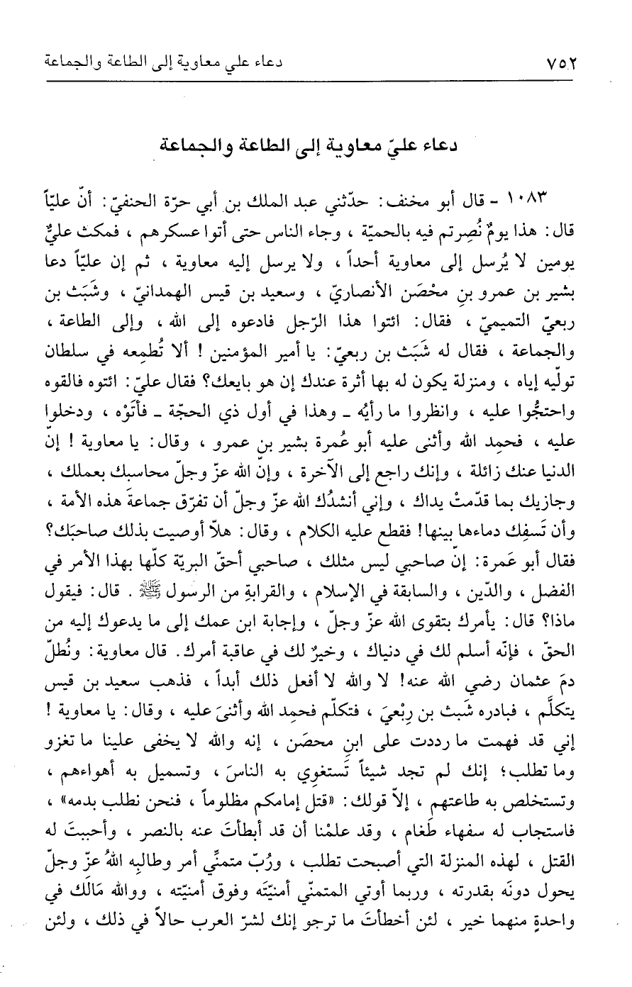 ١٠٨٣ - قال أبو مخنف: حدّثني عبد الملك بن أبي حرّة الحنفيّ: أنّ عليًّا قال: هذا يومٌ نُصِرتم فيه بالحميّة، وجاء الناس حتى أتوا عسكرهم، فمكث عليٌّ يومين لا يُرسل إلى معاوية أحدًا، ولا يرسل إليه معاوية، ثم إن عليًّا دعا بشير بن عمرو بنِ محْصَن الأنصاريّ، وسعيد بن قيس الهمدانيّ، وشَبَث بن ربعيّ التميميّ، فقال: ائتوا هذا الرّجل فادعوه إلى الله، وإلى الطاعة، والجماعة، فقال له شَبَث بن ربعيّ: يا أمير المؤمنين! ألا تُطمِعه في سلطان تولّيه إياه، ومنزلة يكون له بها أثرة عندك إن هو بايعك؟ فقال عليّ: ائتوه فالقوه واحتجُّوا عليه، وانظروا ما رأيُه -وهذا في أول ذي الحجّة- فأتَوْه، ودخلوا عليه، فحمِد الله وأثنى عليه أبو عُمرة بشير بن عمرو، وقال: يا معاوية! إنّ الدنيا عنك زائلة، وإنك راجع إلى الآخرة، وإن الله عزّ وجلّ محاسبك بعملك، وجازيك بما قدّمتْ يداك، وإني أنشدُك الله عزّ وجلّ أن تفرّق جماعةَ هذه الأمة، وأن تَسفِك دماءها بينها! فقطع عليه الكلام، وقال: هلّا أوصيت بذلك صاحبَك؟ فقال أبو عَمرة: إنّ صاحبي ليس مثلك، صاحبي أحقّ البريّة كلّها بهذا الأمر في الفضل، والدّين، والسابقة في الإسلام، والقرابةِ من الرسول - صلى الله عليه وسلم -. قال: فيقول ماذا؟ قال: يأمرك بتقوى الله عزّ وجلّ، وإجابة ابن عمك إلى ما يدعوك إليه من الحقّ، فإنّه أسلم لك في دنياك، وخيرٌ لك في عاقبة أمرك. قال معاوية: ونُطلّ دمَ عثمان رضي الله عنه! لا والله لا أفعل ذلك أبدًا، فذهب سعيد بن قيس يتكلّم، فبادره شَبث بن رِبْعيّ، فتكلّم فحمِد الله وأثنىَ عليه، وقال: يا معاوية! إني قد فهمت ما رددت على ابنِ محصَن، إنه والله لا يخفى علينا ما تغزو وما تطلب؛ إنك لم تجد شيئًا تَستغوِي به الناسَ، وتستميل به أهواءهم، وتستخلص به طاعتهم، إلّا قولك: "قتل إمامكم مظلومًا، فنحن نطلب بدمه"، فاستجاب له سفهاء طغام، وقد علمْنا أن قد أبطأتَ عنه بالنصر، وأحببتَ له القتل، لهذه المنزلة التي أصبحت تطلب، ورُبّ متمنِّي أمر وطالبِه اللهُ عزّ وجلّ يحول دونَه بقدرته، وربما أوتي المتمنّي أمنيّتَه وفوق أمنيّته، ووالله مَا لَك في واحدةٍ منهما خير، لئن أخطأتَ ما ترجو إنك لشرّ العرب حالًا في ذلك، ولئن