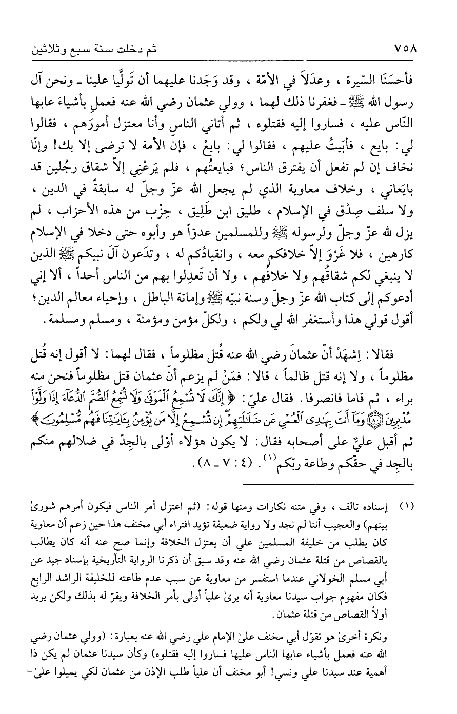 فقالا: اِشهَدْ أنّ عثمانَ رضي الله عنه قُتل مظلومًا، فقال لهما: لا أقول إنه قُتل مظلومًا، ولا إنه قتل ظالمًا، قالا: فمَنْ لم يزعم أنّ عثمان قتل مظلومًا فنحن منه براء، ثم قاما فانصرفا. فقال عليّ: {إِنَّكَ لَا تُسْمِعُ الْمَوْتَى وَلَا تُسْمِعُ الصُّمَّ الدُّعَاءَ إِذَا وَلَّوْا مُدْبِرِينَ (٨٠) وَمَا أَنْتَ بِهَادِي الْعُمْيِ عَنْ ضَلَالَتِهِمْ إِنْ تُسْمِعُ إِلَّا مَنْ يُؤْمِنُ بِآيَاتِنَا فَهُمْ مُسْلِمُونَ} ثم أقبل عليّ على أصحابه فقال: لا يكون هؤلاء أوْلى بالجِدّ في ضلالهم منكم بالجِد في حقّكم وطاعة ربّكم (١). (٤: ٧ - ٨).