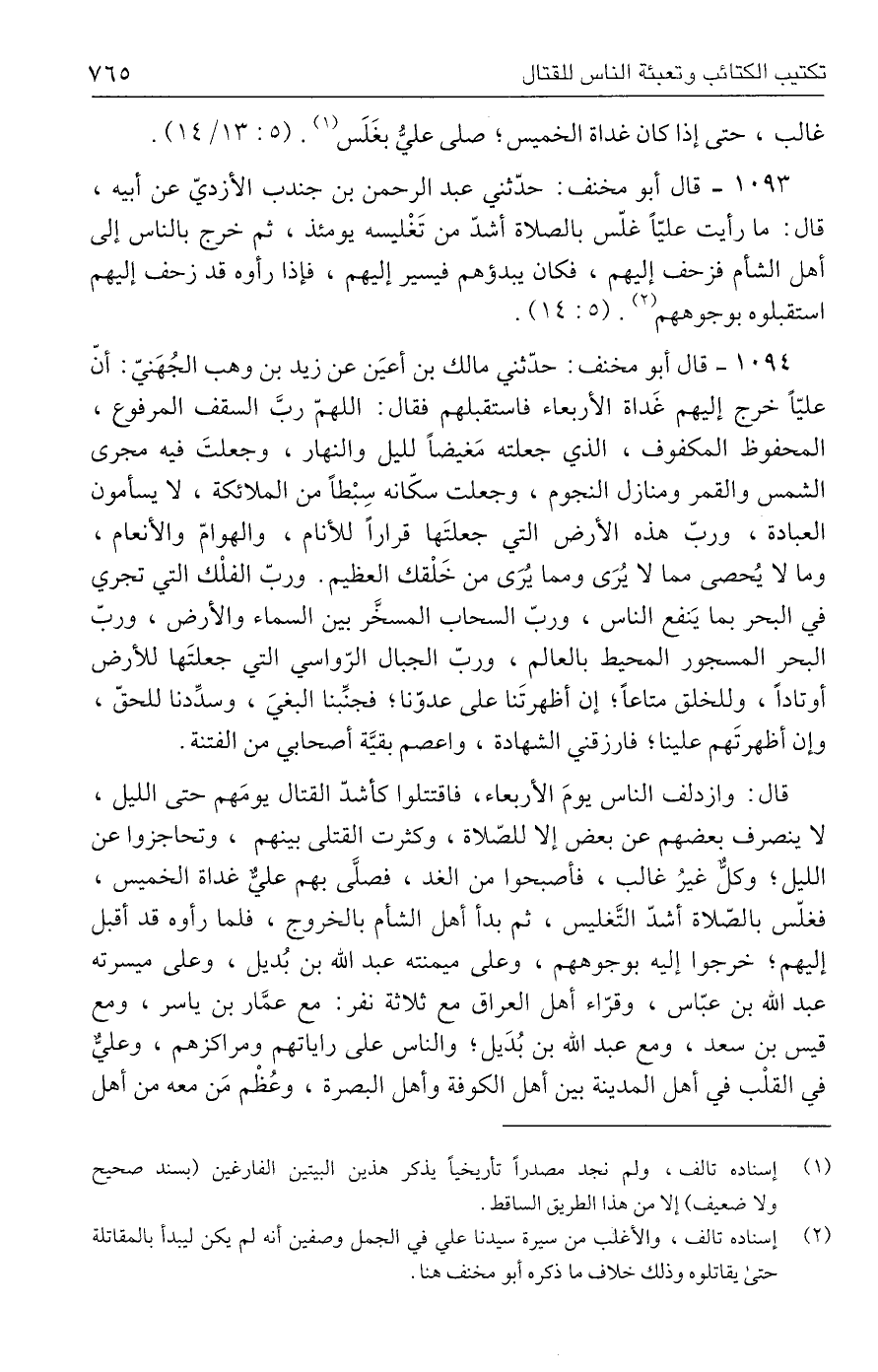 ١٠٩٤ - قال أبو مخنف: حدّثني مالك بن أعيَن عن زيد بن وهب الجُهَنيّ: أنّ عليًّا خرج إليهم غَداة الأربعاء فاستقبلهم فقال: اللهمّ ربَّ السقف المرفوع، المحفوظ المكفوف، الذي جعلته مَغيضًا لليل والنهار، وجعلتَ فيه مجرى الشمس والقمر ومنازل النجوم، وجعلت سكّانه سِبْطًا من الملائكة، لا يسأمون العبادة، وربّ هذه الأرض التي جعلتَها قرارًا للأنام، والهوامّ والأنعام، وما لا يُحصى مما لا يُرَى ومما يُرَى من خَلْقك العظيم. وربّ الفلْك التي تجري في البحر بما يَنفع الناس، وربّ السحاب المسخَّر بين السماء والأرض، وربّ البحر المسجور المحيط بالعالم، وربّ الجبال الرّواسي التي جعلتَها للأرض أوتادًا، وللخلق متاعًا؛ إن أظهرتَنا على عدوّنا؛ فجنِّبنا البغيَ، وسدِّدنا للحقّ، وإن أظهرتَهم علينا؛ فارزقني الشهادة، واعصم بقيَّة أصحابي من الفتنة.