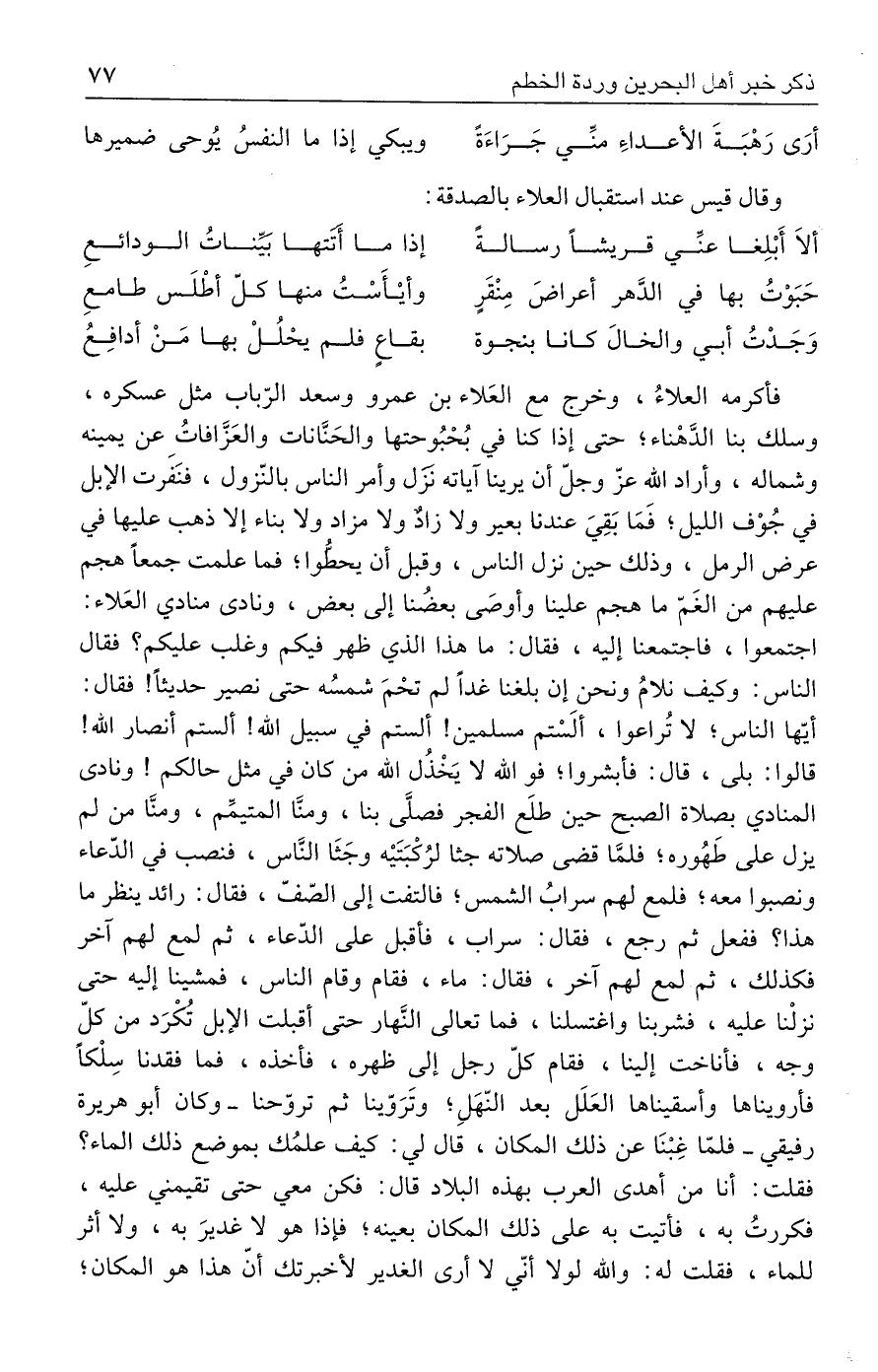 فأكرمه العلاءُ، وخرج مع العَلاء بن عمرو وسعد الرّباب مثل عسكره، وسلك بنا الدَّهْناء؛ حتى إذا كنا في بُحْبُوحتها والحَنَّانات والعَزَّافاتُ عن يمينه وشماله، وأراد الله عزّ وجلّ أن يرينا آياته نزَل وأمر الناس بالنّزول، فنَفرت الإبل في جُوْف الليل؛ فَمَا بَقِيَ عندنا بعير ولا زادٌ ولا مزاد ولا بناء إلا ذهب عليها في عرض الرمل، وذلك حين نزل الناس، وقبل أن يحطُّوا؛ فما علمت جمعًا هجم عليهم من الغَمّ ما هجم علينا وأوصَى بعضنا إلى بعض، ونادى منادي العَلاء: اجتمعوا، فاجتمعنا إليه، فقال: ما هذا الذي ظهر فيكم وغلب عليكم؟ فقال الناس: وكيف نلامُ ونحن إن بلغنا غدًا لم تحْمَ شمسُه حتى نصير حديثًا! فقال: أيّها الناس؛ لا تُراعوا، ألَسْتم مسلمين! ألستم في سبيل الله! ألستم أنصار الله! قالوا: بلى، قال: فأبشروا؛ فوالله لا يَخْذُل الله من كان في مثل حالكم! ونادى المنادي بصلاة الصبح حين طلَع الفجر فصلَّى بنا، ومنَّا المتيمِّم، ومنَّا من لم يزل على طَهُوره؛ فلمَّا قضى صلاته جثا لرُكْبَتَيه وجَثَا النَّاس، فنصب في الدّعاء ونصبوا معه؛ فلمع لهم سرابُ الشمس؛ فالتفت إلى الصّفّ، فقال: رائد ينظر ما هذا؟ ففعل ثم رجع، فقال: سراب، فأقبل على الدّعاء، ثم لمع لهم آخر فكذلك، ثم لمع لهم آخر، فقال: ماء، فقام وقام الناس، فمشينا إليه حتى نزلْنا عليه، فشربنا واغتسلنا، فما تعالى النَّهار حتى أقبلت الإبل تكْرَد من كلّ وجه، فأناخت إلينا، فقام كلّ رجل إلى ظهره، فأخذه، فما فقدنا سِلْكًا فأرويناها وأسقيناها العَلَل بعد النّهَلِ؛ وتَرَوّينا ثم تروّحنا -وكان أبو هريرة رفيقي- فلمّا غِبْنَا عن ذلك المكان، قال لي: كيف علمُك بموضع ذلك الماء؟ فقلت: أنا من أهدى العرب بهذه البلاد قال: فكن معي حتى تقيمني عليه، فكررتُ به، فأتيت به على ذلك المكان بعينه؛ فإذا هو لا غديرَ به، ولا أثر للماء، فقلت له: والله لولا أنّي لا أرى الغدير لأخبرتك أنّ هذا هو المكان؛