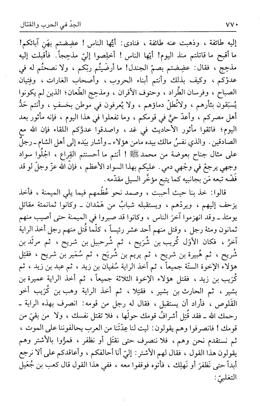 إليه طائفة، وذهبت عنه طائفة، فنادى: أيُّها الناس! عضِضتم بهَنِ آبائكم! ما أقبح ما قاتلتم منذ اليوم! أيُّها الناس! أخلِصوا إليَّ مذحِجًا. فأقبلت إليه مذحِج، فقال: عضِضتم بصمّ الجندل! ما أرضَيتُم ربّكم، ولا نصحتُم له في عدوّكم، وكيف بذلك وأنتم أبناء الحروب، وأصحاب الغارات، وفِتيان الصباح، وفرسان الطِّراد، وحتوف الأقران، ومذحِج الطّعان؛ الذين لم يكونوا يُسبَقون بثأرهم، ولا تُطلّ دماؤهم، ولا يُعرفون في موطن بخسفٍ، وأنتم حَدُّ أهل مصركم، وأعدّ حيٍّ في قومكم، وما تفعلوا في هذا اليوم، فإنه مأثور بعد اليوم؛ فاتقوا مأثور الأحاديث في غد، واصدقوا عدوَّكم اللقاء فإن الله مع الصادقين. والذي نفسُ مالك بيده ما من هؤلاء -وأشار بيَده إلى أهل الشام- رجلٌ على مثال جناح بعوضة من محمد - صلى الله عليه وسلم -! أنتم ما أحسنتم القِراع، اجْلُوا سواد وجهي يرجعْ في وجْهي دمي. عليكم بهذا السواد الأعظم، فإنّ الله عزّ وجلّ لو قد فَضّه تبعه مَن بجانبيه كما يتبع مؤخَّر السيل مقدّمه.