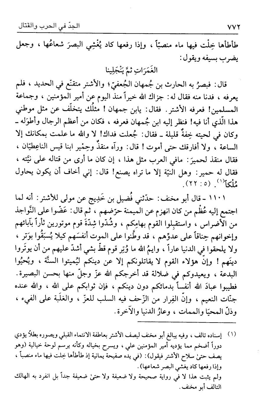 طأطأها خِلْت فيها ماء منصبًّا، وإذا رفعها كاد يُغْشِي البصرَ شعاعُها، وجعل يضرب بسيفه ويقول: الغَمَرَاتِ ثمَّ يَنْجَلِينا قال: فبصرُ به الحارث بن جُمهان الجُعفيّ؛ والأشتر متقنّع في الحديد، فلم يعرفه، فدنا منه فقال له: جزاك الله خيرًا منذ اليوم عن أمير المؤمنين، وجماعة المسلمين! فعرفه الأشتر. فقال: يابن جمهان! مثلُك يتخلّف عن مثل موطني هذا الّذي أنا فيه! فنظر إليه ابن جُمهان فعرفه، فكان من أعظم الرجال وأطوَله -وكان في لحيته خِفةٌ قليلة- فقال: جُعلت فداك! لا والله ما علمت بمكانك إلا الساعة، ولا أفارقك حتى أموت! قال: ورآه منقذٌ وحِمْير ابنا قيس الناعِطيّان، فقال منقذ لحميرَ: ما في العرب مثل هذا، إن كان ما أرى من قتاله على نيَّته، فقال له حمير: وهل النيّة إلا ما تراه يصنع! قال: إني أخاف أن يكون يحاول مُلْكًا (١). (٥: ٢٢).