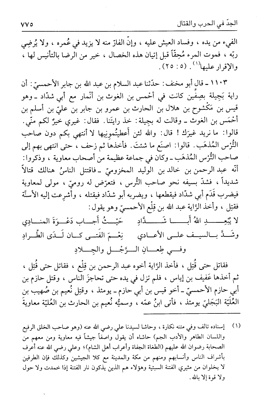 ١١٠٣ - قال أبو مخنف: حدّثنا عبد السلام بن عبد الله بن جابر الأحمسيّ: أن راية بَجِيلة بصِفِّين كانت في أحْمس بن الغوث بن أنْمار مع أبي شدّاد -وهو قيس بن مَكْشوح بن هلال بن الحارث بن عمرو بن جابر بن عليّ بن أسلم بن أحْمَس بن الغوث- وقالت له بجِيلة: خذ رايتَنا. فقال: غيري خيرٌ لكم منّي. قالوا: ما نريد غيرَك! قال: والله لئن أَعطيتُمونِيها لا أنتهي بكم دون صاحب التُّرْس المُذهَب. قالوا: اصنَع ما شئتَ. فأخذها ثم زحف، حتى انتهى بهم إلى صاحب التُّرْس المُذهَب -وكان في جماعة عظيمة من أصحاب معاوية، وذكروا: أنّه عبد الرحمن بن خالد بن الوليد المخزوميّ- فاقتتل الناسُ هنالك قتالًا شديدًا، فشدّ بسيفه نحو صاحب التُّرس، فتعرّض له روميّ، مولى لمعاوية فيضرب قَدَم أبي شدّاد فيقطعها، ويضربه أبو شدّاد فيقتله، وأشرِعت إليه الأسنَّة فقتِل، وأخذ الرَّاية عبد الله بن قِلْع الأحمسيّ وهو يقول: