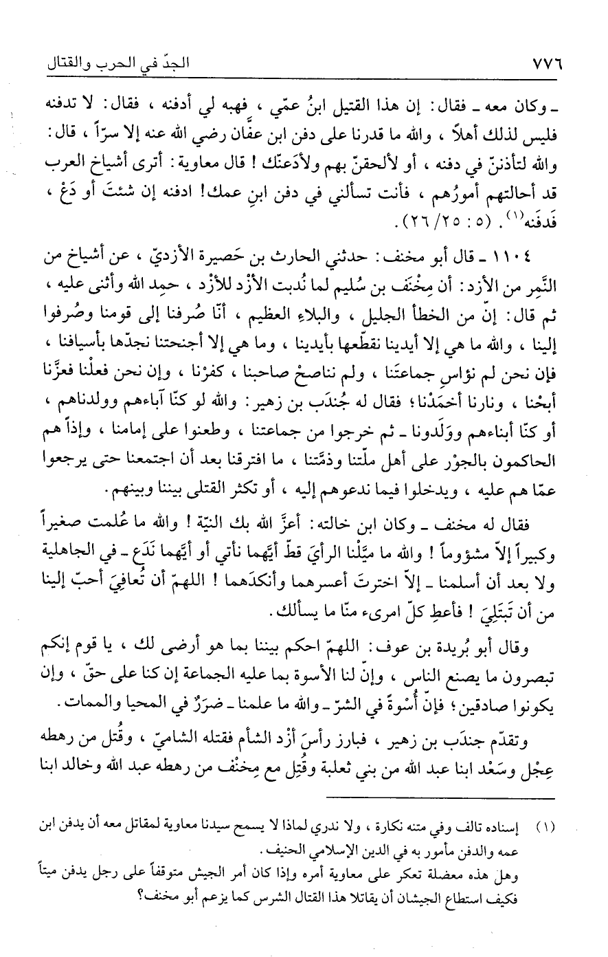 ١١٠٤ - قال أبو مخنف: حدثنى الحارث بن حَصيرة الأزديّ، عن أشياخ من النَّمِر من الأزد: أن مِخْنَف بن سُليم لما نُدبت الأزْد للأزْد، حمِد الله وأثنى عليه، ثم قال: إنّ من الخطأ الجليل، والبلاءِ العظيم، أنّا صُرفنا إلى قومنا وصرفوا إلينا، والله ما هي إلا أيدينا نقطّعها بأيدينا، وما هي إلا أجنحتنا نجدّها بأسيافنا، فإن نحن لم نؤاسِ جماعتَنا، ولم نناصحْ صاحبنا، كفرْنا، وإن نحن فعلْنا فعزَّنا أبحْنا، ونارنا أخمَدْنا؛ فقال له جُندَب بن زهير: والله لو كنّا آباءهم وولدناهم، أو كنّا أبناءهم ووَلَدونا- ثم خرجوا من جماعتنا، وطعنوا على إمامنا، وإذًا هم الحاكمون بالجوْر على أهل ملّتنا وذمَّتنا، ما افترقنا بعد أن اجتمعنا حتى يرجعوا عمّا هم عليه، ويدخلوا فيما ندعوهم إليه، أو تكثر القتلى بيننا وبينهم.
