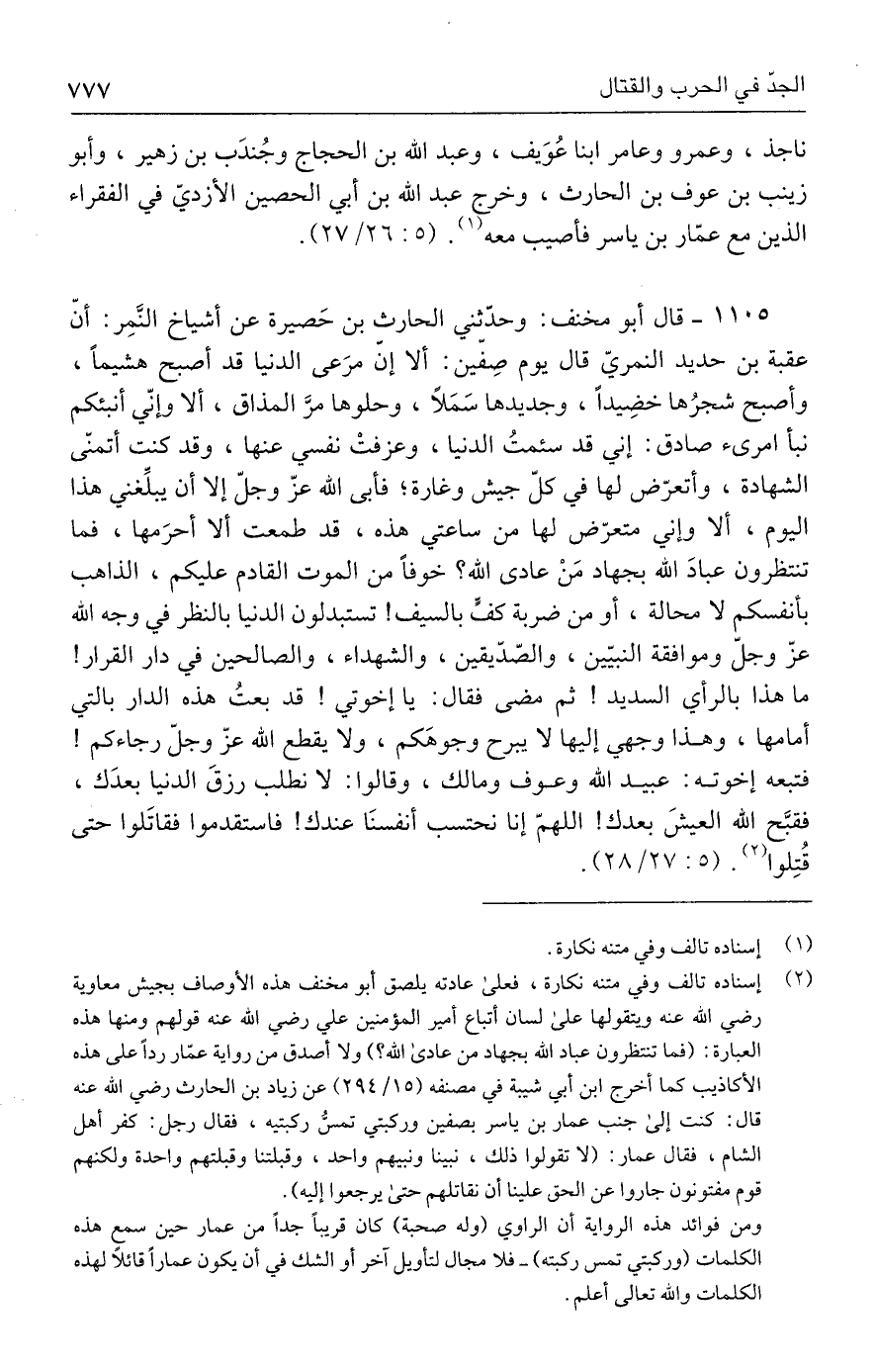 (٢) إسناده تالف وفي متنه نكارة، فعلى عادته يلصق أبو مخنف هذه الأوصاف بجيش معاوية رضي الله عنه ويتقولها على لسان أتباع أمير المؤمنين علي رضي الله عنه قولهم ومنها هذه العبارة: (فما تنتظرون عباد الله بجهاد من عادى الله؟ ) ولا أصدق من رواية عمّار ردًا على هذه الأكاذيب كما أخرج ابن أبي شيبة في مصنفه (١٥/ ٢٩٤) عن زياد بن الحارث رضي الله عنه قال: كنت إلى جنب عمار بن ياسر بصفين وركبتي تمسُّ ركبتيه، فقال رجل: كفر أهل الشام، فقال عمار: (لا تقولوا ذلك، نبينا ونبيهم واحد، وقبلتنا وقبلتهم واحدة ولكنهم قوم مفتونون جاروا عن الحق علينا أن نقاتلهم حتى يرجعوا إليه).