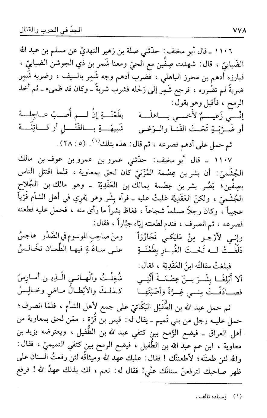 ١١٠٧ - قال أبو مخنف: حدّثني عمرو بن عمرو بن عوف بن مالك الجُشَميّ: أن بشر بن عِصْمة المُزَنيّ كان لحق بمعاوية، فلما اقتتل الناس بصِفِّين؛ بَصُر بشر بن عِصْمة بمالك بن العَقَدِيّة -وهو مالك بن الجُلاح الجُشَميّ، ولكنّ العَقَدِيّة غلبتْ عليه- فرآه بِشْر وهو يَفرِي في أهل الشام فَرْيًا عجيبًا، وكان رجلًا مسلمًا شجاعًا، فغاظ بشرًا ما رأى منه، فحمل عليه فطعنه فصرعه، ثم انصرف، فندم لطعنته إيّاه جبَّارًا، فقال: