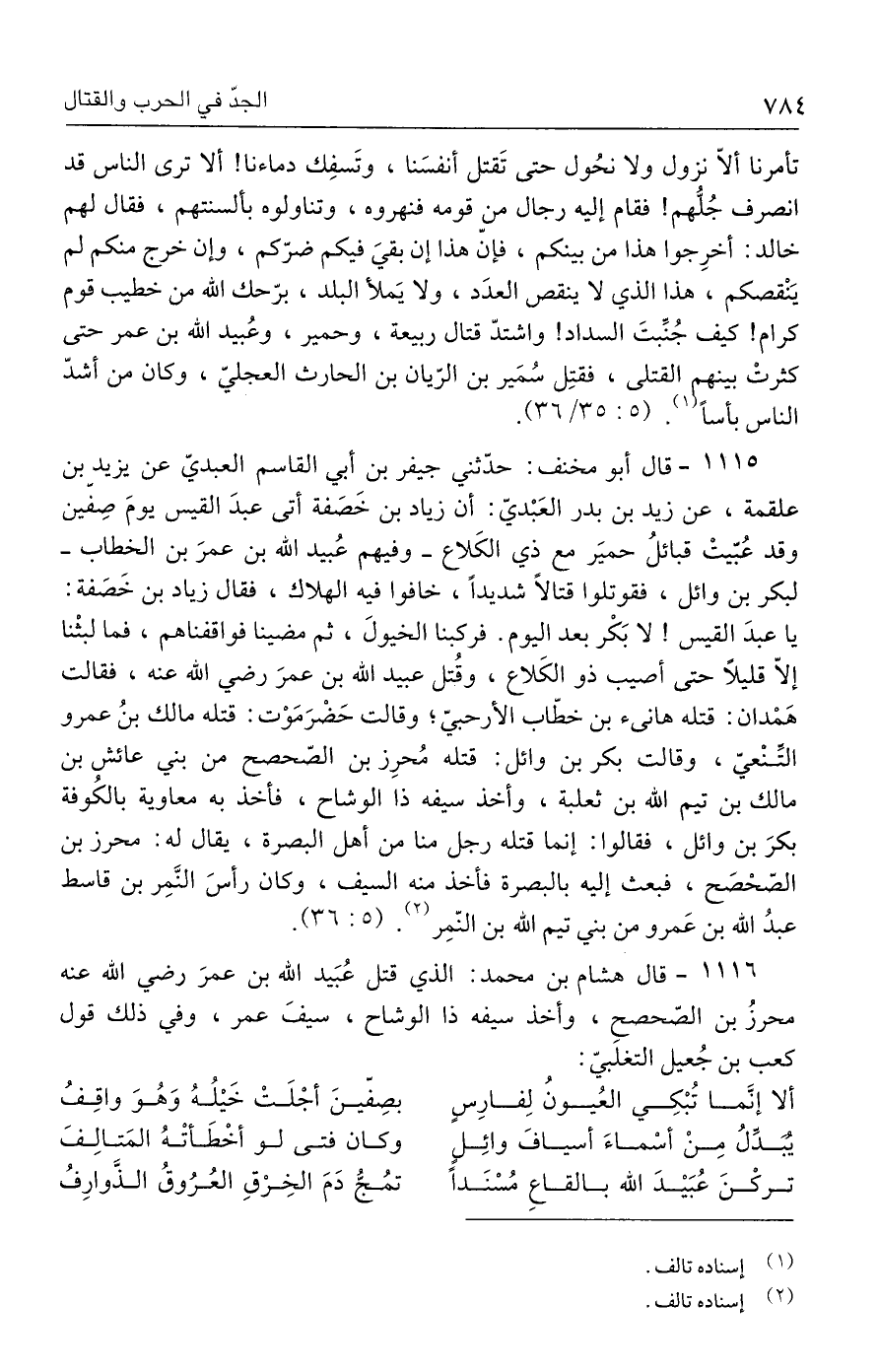 ١١١٥ - قال أبو مخنف: حدّثني جيفر بن أبي القاسم العبديّ عن يزيد بن علقمة، عن زيد بن بدر العَبْديّ: أن زياد بن خَصَفة أتى عبدَ القيس يومَ صفين وقد عُبّيتْ قبائلُ حميَر مع ذي الكَلاع - وفيهم عُبيد الله بن عمرَ بن الخطاب - لبكر بن وائل، فقوتلوا قتالًا شديدًا، خافوا فيه الهلاك، فقال زياد بن خَصَفة: يا عبدَ القيس! لا بَكْر بعد اليوم. فركبنا الخيولَ، ثم مضينا فواقفناهم، فما لبثْنا إلّا قليلًا حتى أصيب ذو الكَلاع، وقُتل عبيد الله بن عمرَ رضي الله عنه، فقالت هَمْدان: قتله هانئ بن خطّاب الأرحبيّ؛ وقالت حَضْرَمَوْت: قتله مالك بنُ عمرو التِّنْعيّ، وقالت بكر بن وائل: قتله مُحرِز بن الصّحصح من بني عائش بن مالك بن تيم الله بن ثعلبة، وأخذ سيفه ذا الوشاح، فأخذ به معاوية بالكُوفة بكرَ بن وائل، فقالوا: إنما قتله رجل منا من أهل البصرة، يقال له: محرز بن الصّحْصح، فبعث إليه بالبصرة فأخذ منه السيف، وكان رأسَ النَّمِر بن قاسط عبدُ الله بن عَمرو من بني تيم الله بن النّمِر (٢). (٥: ٣٦).