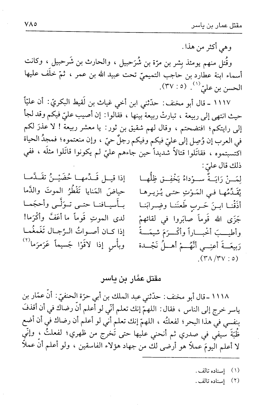 ١١١٨ - قال أبو مخنف: حدّثني عبد الملك بن أبي حرّة الحنفيّ: أنّ عمّار بن ياسر خرج إلى الناس، فقال: اللهمّ إنك تعلم أنّي لو أعلم أنّ رضاك في أن أقذفَ بنفسي في هذا البحر؛ لفعلتُه، اللهمّ إنك تعلم أني لو أعلم أن رضاك في أن أضع ظُبَةَ سيفي في صدري ثم أنحني عليها حتى تَخرج من ظهري؛ لفعلتُ، وإني لا أعلم اليومَ عملًا هو أرضى لك من جهاد هؤلاء الفاسقين، ولو أعلم أنّ عملًا