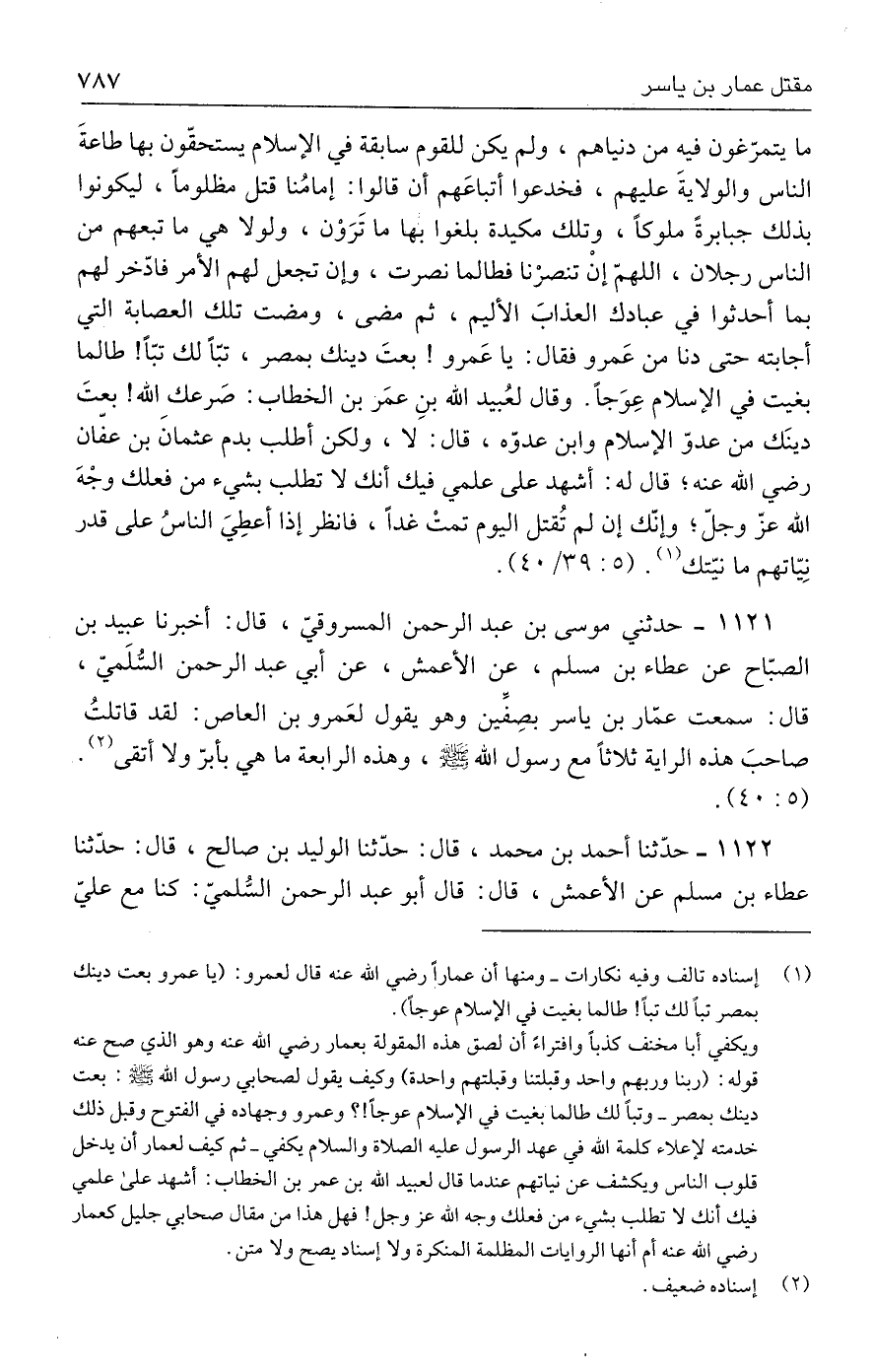 ١١٢١ - حدثني موسى بن عبد الرحمن المسروقيّ، قال: أخبرنا عبيد بن الصبّاح عن عطاء بن مسلم، عن الأعمش، عن أبي عبد الرحمن السُّلَميّ، قال: سمعت عقار بن ياسر بصِفِّين وهو يقول لعَمرو بن العاص: لقد قاتلتُ صاحبَ هذه الراية ثلاثًا مع رسول الله - صلى الله عليه وسلم -، وهذه الرابعة ما هي بأبرّ ولا أتقى (٢). (٤٠: ٥).
