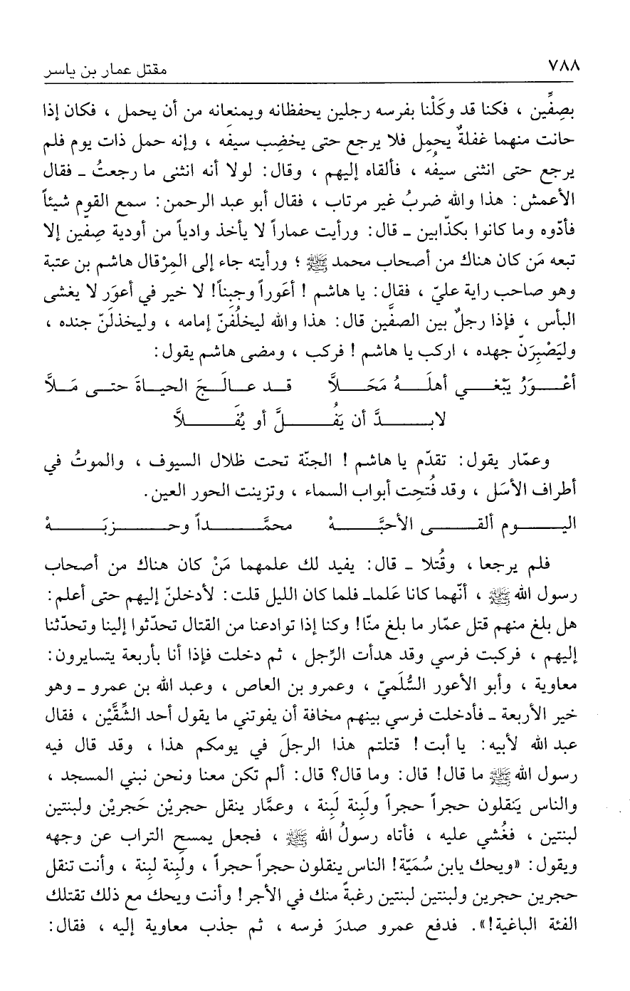 وعمّار يقول: تقدّم يا هاشم! الجنّة تحت ظلال السيوف، والموتُ في أطراف الأسَل، وقد فُتحِت أبواب السماء، وتزينت الحور العين.