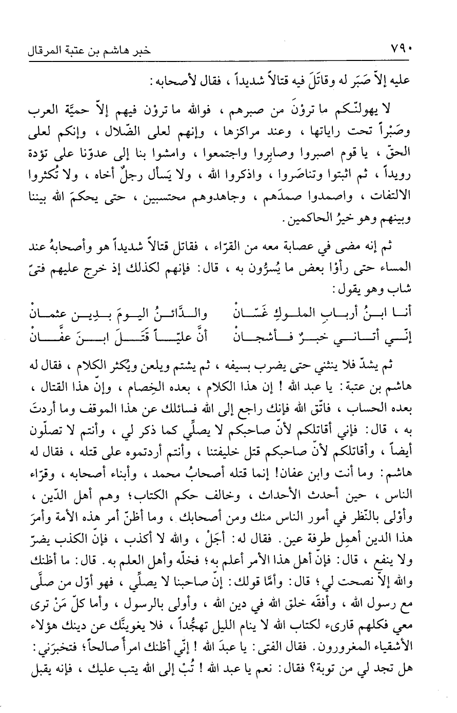 ثم يشدّ فلا ينثني حتى يضرب بسيفه، ثم يشتم ويلعن ويُكثر الكلام، فقال له هاشم بن عتبة: يا عبد الله! إن هذا الكلام، بعده الخِصام، وإن هذا القتال، بعده الحساب، فاتّق الله فإنك راجع إلى الله فسائلك عن هذا الموقف وما أردتَ به، قال: فإني أقاتلكم لأنّ صاحبكم لا يصلِّي كما ذكر لي، وأنتم لا تصلّون أيضًا، وأقاتلكم لأنّ صاحبكم قتل خليفتنا، وأنتم أردتموه على قتله، فقال له هاشم: وما أنت وابن عفان! إنما قتله أصحابُ محمد، وأبناء أصحابه، وقرّاء الناس، حين أحدث الأحداث، وخالف حكم الكتاب؛ وهم أهل الدّين، وأوْلى بالنّظر في أمور الناس منك ومن أصحابك، وما أظنّ أمر هذه الأمة وأمرَ هذا الدين أهمِل طرفة عين. فقال له: أجَلْ، والله لا أكذب، فإن الكذب يضرّ ولا ينفع، قال: فإنّ أهل هذا الأمر أعلم به؛ فخلّه وأهل العلم به. قال: ما أظنك والله إلا نصحت لي؛ قال: وأمَّا قولك: إن صاحبنا لا يصلِّي، فهو أوّل من صلَّى مع رسول الله، وأفقَه خلق الله في دين الله، وأولى بالرسول، وأما كلّ مَنْ ترى معي فكلهم قارئ لكتاب الله لا ينام الليل تهجُّدًا، فلا يغوينَّك عن دينك هؤلاء الأشقياء المغرورون. فقال الفتى: يا عبدَ الله! إنّي أظنك امرأً صالحًا؛ فتخبرَني: هل تجد لي من توبة؟ فقال: نعم يا عبد الله! تُبْ إلى الله يتب عليك، فإنه يقبل