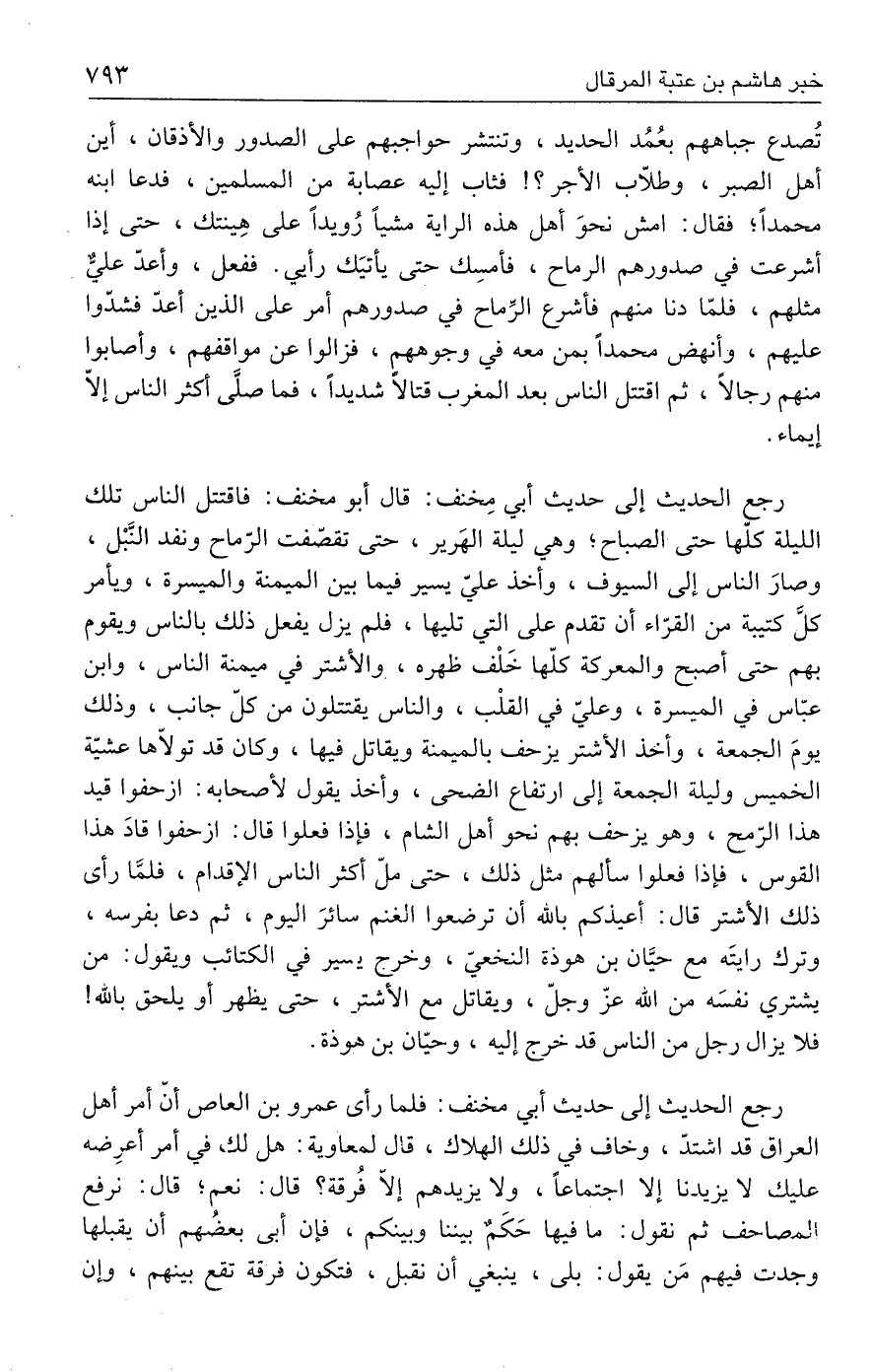 رجع الحديث إلى حديث أبي مِخنف: قال أبو مخنف: فاقتتل الناس تلك الليلة كلّها حتى الصباح؛ وهي ليلة الهَرير، حتى تقصّفت الرّماح ونفد النَّبْل، وصارَ الناس إلى السيوف، وأخذ عليّ يسير فيما بين الميمنة والميسرة، ويأمر كلَّ كتيبةٍ من القرّاء أن تقدم على التي تليها، فلم يزل يفعل ذلك بالناس ويقوم بهم حتى أصبح والمعركة كلّها خَلْف ظهره، والأشتر فى ميمنة الناس، وابن عبّاس في الميسرة، وعليّ فرب القلْب، والناس يقتتلون مْن كلّ جانب، وذلك يومَ الجمعة، وأخذ الأشتر يزحف بالميمنة ويقاتل فيها، وكان قد تولّاها عشيّة الخميس وليلة الجمعة إلى ارتفاع الضحى، وأخذ يقول لأصحابه: ازحفوا قادَ هذا الرّمح، وهو يزحف بهم نحو أهل الشام، فإذا فعلوا قال: ازحفوا قادَ هذا القوس، فإذا فعلوا سألهم مثل ذلك، حتى ملّ أكثر الناس الإقدام، فلمَّا رأق ذلك الأشتر قال: أعيذكم بالله أن ترضعوا الغنم سائرَ اليوم، ثم دعا بفرسه، وترك رايتَه مع حيَّان بن هوذة النخعيّ، وخرح يسير في الكتائب ويقول: من يشتري نفسَه من الله عزّ وجلّ، ويقاتل مع الأشتم، حتى يظهر أو يلحق بالله! فلا يزال رجل من الناس قد خرج إليه، وحيّان بن هوذة.