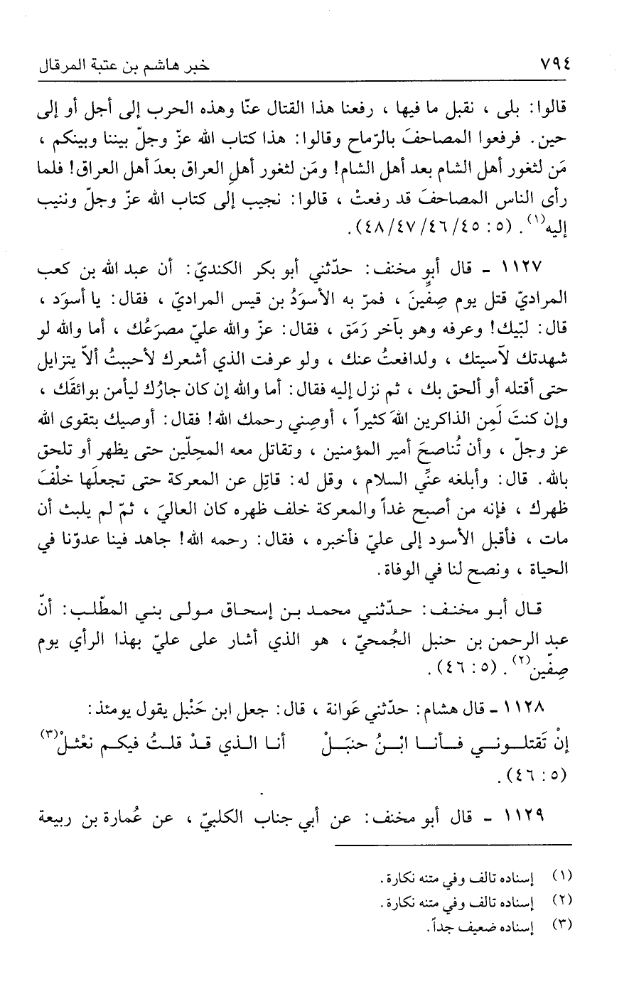 ١١٢٧ - قال أبو مخنف: حدّثني أبو بكر الكنديّ: أن عبد الله بن كعب المراديّ قتل يوم صفينَ، فمرّ به الأسوَدُ بن قيس المراديّ، فقال: يا أسوَد، قال: لبّيك! وعرفه وهو بآخر رَمَق، فقال: عزّ والله عليّ مصرَعُك، أما والله لو شهدتك لآسيتك، ولدافعتُ عنك، ولو عرفت الذي أشعرك لأحببتُ ألّا يتزايل حتى أقتله أو ألحق بك، ثم نزل إليه فقال: أما والله إن كان جارُك ليأمن بوائقَك، وإن كنتَ لَمِن الذاكرين اللهَ كثيرًا، أوصِني رحمك الله! فقال: أوصيك بتقوى الله عز وجلّ، وأن تُناصحَ أمير المؤمنين، وتقاتل معه المحِلّين حتى يظهر أو تلحق بالله. قال: وأبلغه عنَي السلام، وقل له: قاتِل عن المعركة حتى تجعلَها خلْفَ ظهرك، فإنه من أصبح غدًا والمعركة خلف ظهره كان العاليَ، ثمّ لم يلبث أن مات، فأقبل الأسود إلى عليّ فأخبره، فقال: رحمه الله! جاهد فينا عدوّنا في الحياة، ونصح لنا في الوفاة.