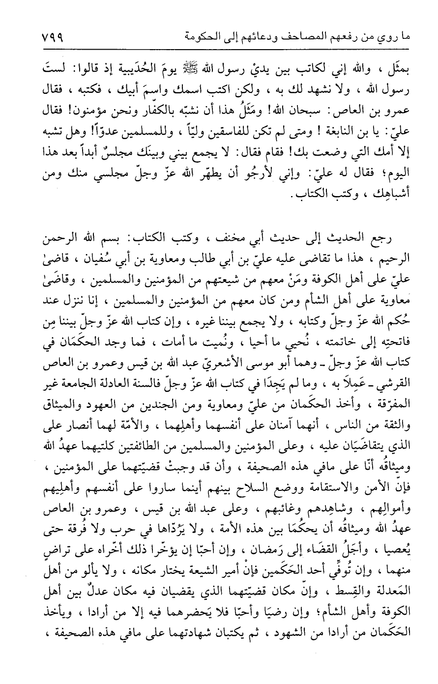 رجع الحديث إلى حديث أبي مخنف، وكتب الكتاب: بسم الله الرحمن الرحيم، هذا ما تقاضى عليه عليّ بن أبي طالب ومعاوية بن أبي سُفيان، قاضى عليّ على أهل الكوفة ومَنْ معهم من شيعتهم من المؤمنين والمسلمين، وقاضَى معاوية على أهل الشأم ومن كان معهم من المؤمنين والمسلمين، إنا ننزل عند حُكم الله عزّ وجلّ وكتابه، ولا يجمع بيننا غيره، وإن كتاب الله عزّ وجلّ بيننا مِن فاتحتِه إلى خاتمته، نُحيي ما أحيا، ونُميت ما أمات، فما وجد الحكَمَان في كتاب الله عزّ وجلّ - وهما أبو موسى الأشعريّ عبد الله بن قيس وعمرو بن العاص القرشي - عَمِلَا به، وما لم يَجِدَا في كتاب الله عزّ وجلّ فالسنة العادلة الجامعة غير المفرّقة، وأخذ الحكَمان من عليّ ومعاوية ومن الجندين من العهود والميثاق والثقة من الناس، أنهما آمنان على أنفسهما وأهلِهما، والأمّة لهما أنصار على الذي يتقاضيَان عليه، وعلى المؤمنين والمسلمين من الطائفتين كلتيهما عهدُ الله وميثاقُه أنّا على ما في هذه الصحيفة، وأن قد وجبتْ قضيّتهما على المؤمنين، فإنّ الأمن والاستقامة ووضع السلاح بينهم أينما ساروا على أنفسهم وأهلِيهم وأموالِهم، وشاهِدهم وغائبهم، وعلى عبد الله بن قيس، وعمرو بن العاص عهدُ الله وميثاقُه أن يحكُمَا بين هذه الأمة، ولا تردّاها في حرب ولا فُرقة حتى يُعصيا، وأجَلُ القضَاء إلى رَمضان، وإن أحبّا إن يؤخّرا ذلك أخّراه على تراضٍ منهما، وإن تُوفِّي أحد الحَكَمين فإنْ أمير الشيعة يختار مكانه، ولا يألو من أهل المَعدلة والقِسط، وإنّ مكان قضيّتهما الذي يقضيان فيه مكان عدلٌ بين أهل الكوفة وأهل الشأم؛ وإن رضيَا وأحبّا فلا يَحضرهما فيه إلا من أرادا، ويأخذ الحَكَمان من أرادا من الشهود، ثم يكتبان شهادتهما على ما في هذه الصحيفة،