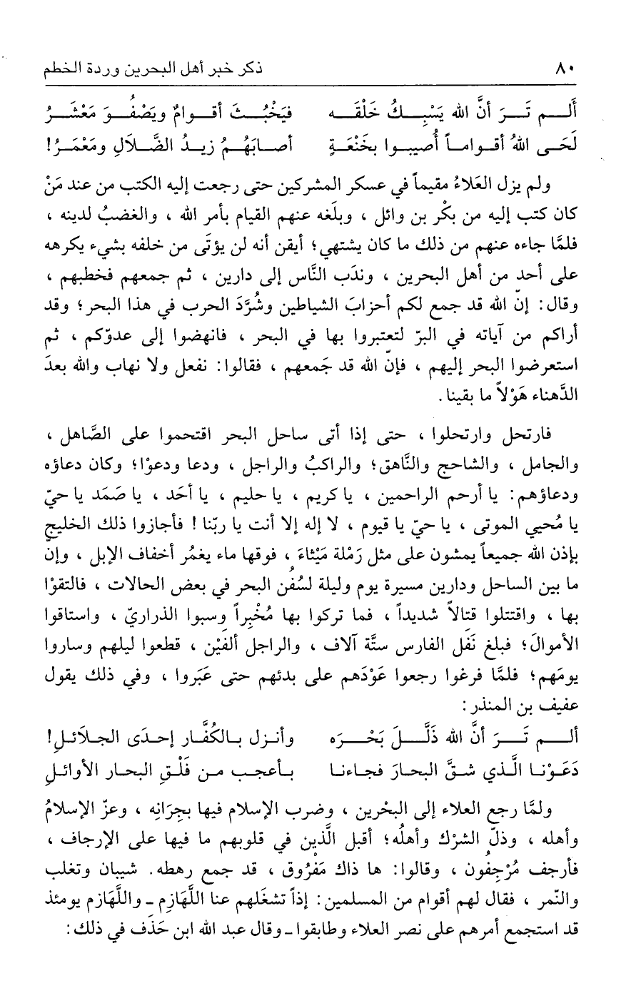 فارتحل وارتحلوا، حتى إذا أتى ساحل البحر اقتحموا على الصَّاهل، والجامل، والشاحج والنَّاهق؛ والراكبُ والراجل، ودعا ودعوْا؛ وكان دعاؤه ودعاؤهم: يا أرحم الراحمين، يا كريم، يا حليم، يا أحَد، يا صَمَد يا حيّ يا مُحيي الموتى، يا حيّ يا قيوم، لا إله إلا أنت يا ربّنا! فأجازوا ذلك الخليج بإذن الله جميعًا يمشون على مثل رَمْلة مَيثاءَ، فوقها ماء يغمُر أخفاف الإبل، وإن ما بين الساحل ودارين مسيرة يوم وليلة لسُفُن البحر في بعض الحالات، فالتقوْا بها، واقتتلوا قتالًا شديدًا، فما تركوا بها مُخْبِرًا وسبوا الذراريّ، واستاقوا الأموال؛ فبلغ نَفَل الفارس ستَّة آلاف، والراجل ألفين، قطعوا ليلهم وساروا يومَهم؛ فلمَّا فرغوا رجعوا عَوْدَهم على بدئهم حتى عَبَروا، وفي ذلك يقول عفيف بن المنذر: