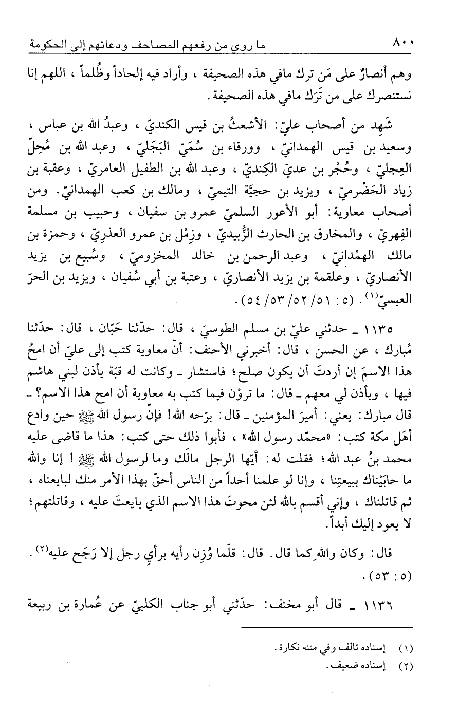 ١١٣٥ - حدثني عليّ بن مسلم الطوسيّ، قال: حدّثنا حَبّان، قال: حدّثنا مُبارك، عن الحسن، قال: أخبرني الأحنف: أنّ معاوية كتب إلى عليّ أن امحُ هذا الاسمَ إن أردتَ أن يكون صلح؛ فاستشار -وكانت له قبّة يأذن لبني هاشم فيها، ويأذن لي معهم- قال: ما تروْن فيما كتب به معاوية أن امح هذا الاسم؛ - قال مبارك: يعني: أميرَ المؤمنين - قال: برّحه الله! فإنّ رسول الله - صلى الله عليه وسلم - حين وادع أهَل مكة كتب: "محمّد رسول الله"، فأبوا ذلك حتى كتب: هذا ما قاضى عليه محمد بنُ عبد الله، فقلت له: أيّها الرجل مالَك وما لرسول الله - صلى الله عليه وسلم -! إنا والله ما حابَيْناك ببيعتِنا، وإنا لو علمنا أحدًا من الناس أحق بهذا الأمر منك لبايعناه، ثم قاتلناك، وإني أقسم بالله لئن محوتَ هذا الاسم الذي بايعتَ عليه، وقاتلتهم؛ لا يعود إليك أبدًا.