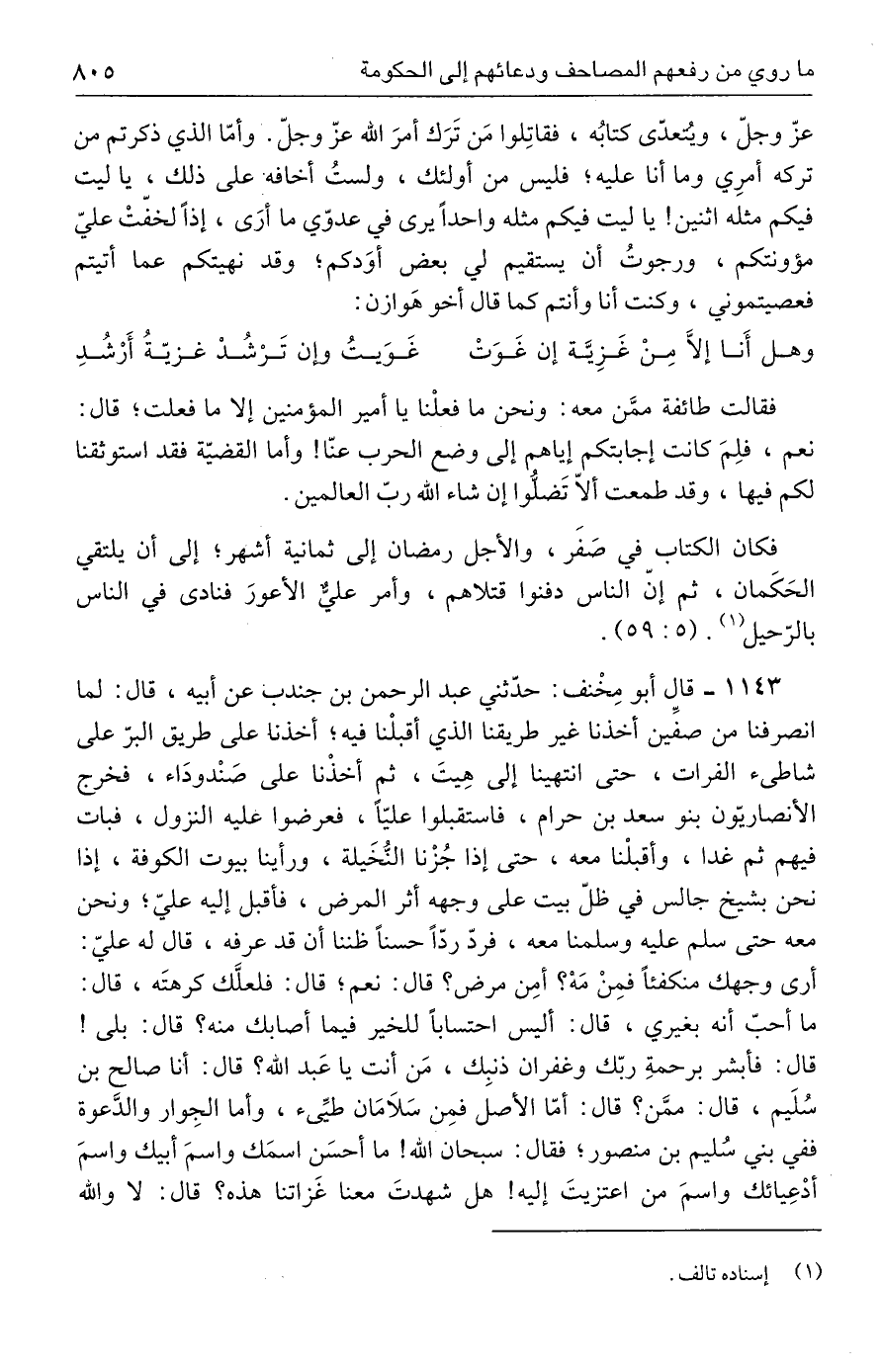 ١١٤٣ - قال أبو مِخْنف: حدّثني عبد الرحمن بن جندت عن أبيه، قال: لما انصرفنا من صفِّين أخذنا غير طريقنا الذي أقبلْنا فيه؛ أخذنا على طريق البرّ على شاطئ الفرات، حتى انتهينا إلى هِيتَ، ثم أخذْنا على صَنْدودَاء، فخرج الأنصاريّون بنو سعد بن حرام، فاستقبلوا عليّا، فعرضوا عليه النزول، فبات فيهم ثم غدا، وأقبلْنا معه، حتى إذا جُزْنا النُّخَيلة، ورأينا بيوت الكوفة، إذا نحن بشيخ جالس في ظلّ بيت على وجهه أثر المرض، فأقبل إليه عليّ، ونحن معه حتى سلم عليه وسلمنا معه، فردّ ردًّا حسنًا ظننا أن قد عرفه، قال له عليّ: أرى وجهك منكفئًا فمِنْ مَهْ؟ أمِن مرض؟ قال: نعم، قال: فلعلَّك كرهتَه، قال: ما أحبّ أنه بغيري، قال: أليس احتسابًا للخير فيما أصابك منه؟ قال: بلى! قال: فأبشر برحمةِ ربّك وغفران ذنبِك، مَن أنت يا عَبد الله؟ قال: أنا صالح بن سُلَيم، قال: ممَّن؟ قال: أمّا الأصل فمِن سَلَامَان طيِّئ، وأما الجِوار والدَّعوة ففي بني سُليم بن منصور؛ فقال: سبحان الله! ما أحسَن اسمَك واسمَ أبيك واسمَ أدْعِيائك واسمَ من اعتزيتَ إليه! هل شهدتَ معنا غَزاتنا هذه؟ قال: لا والله